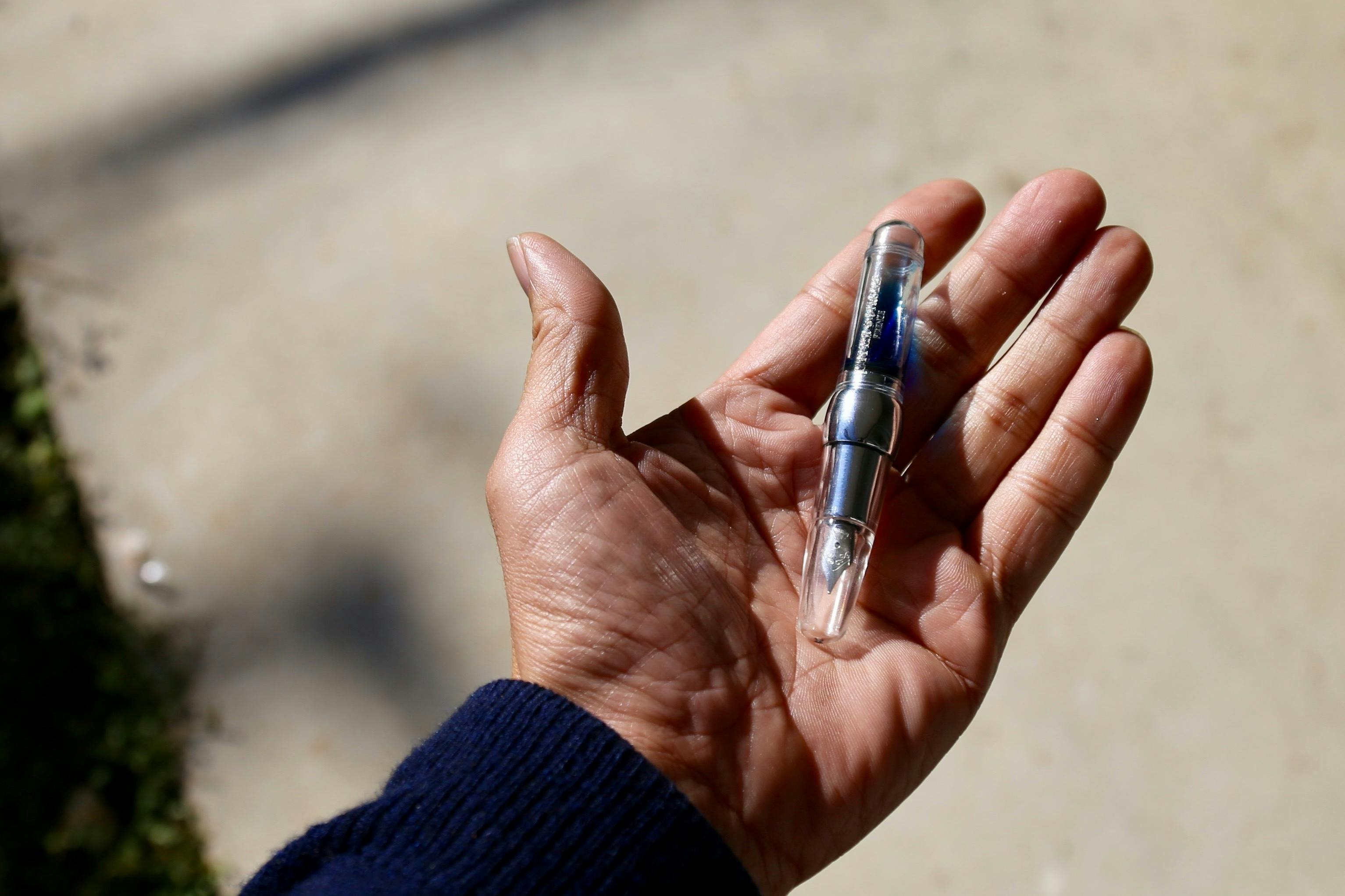 透明なボディーにこだわったのは、さまざまなインクの「色」を楽しんで欲しい!との思いがあります。ケースには万年筆本体の他に、お気に入りのインクを持ち運べるように、2ccほど入る容器が2つセットになっています。