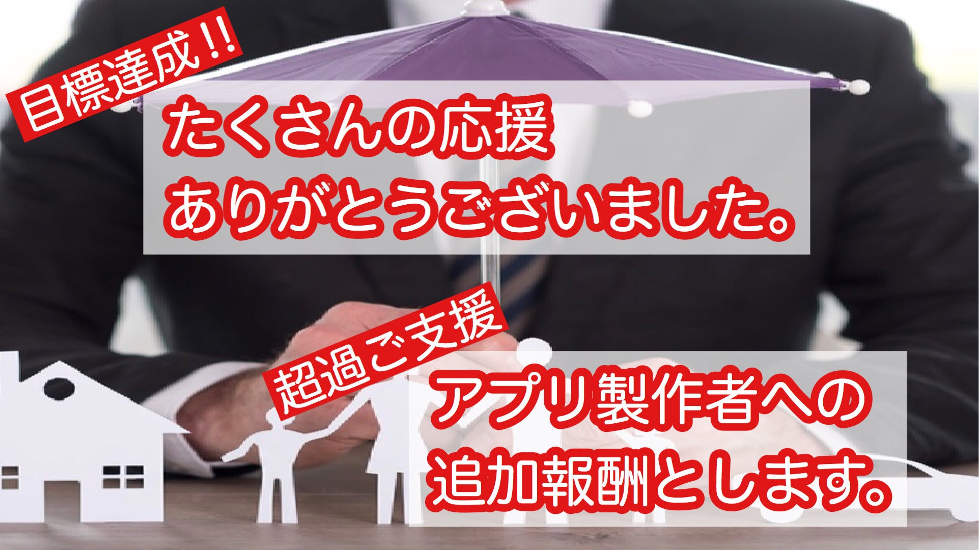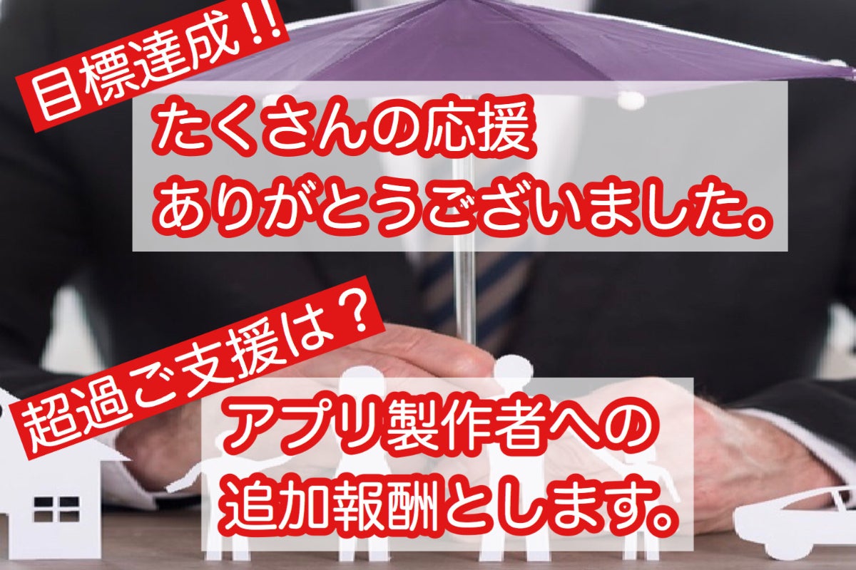 2020/05/19 10:15応援ありがとうございました。沢山の方々からいただいたご支援・応援のおかげで無事にプロジェクトが目標達成することができました。誠にありがとうございます。想定よりも速い目標達成に伴い、アプリ製作を「ココナラ」というプロの技術者が集まるサイトからお願いしている段階でございます。そこで、残りの期限でご支援いただいた超過金額については実際にアプリを製作いただいてくださる技術者さんへの追加報酬に充てさせていただきます。さまざまなご意見があるかと思われますが、アプリを実際に制作いただいている技術者さんのモチベーション向上とさらなる質の向上がご支援の最も効果的な使用方法だと判断いたしました。結果として、より良いアプリを皆様に提供できるかと思われますのでご理解の程、宜しくお願いいたします。最後になりますが、たくさんの応援をいただき誠にありがとうございます。 もっと見る