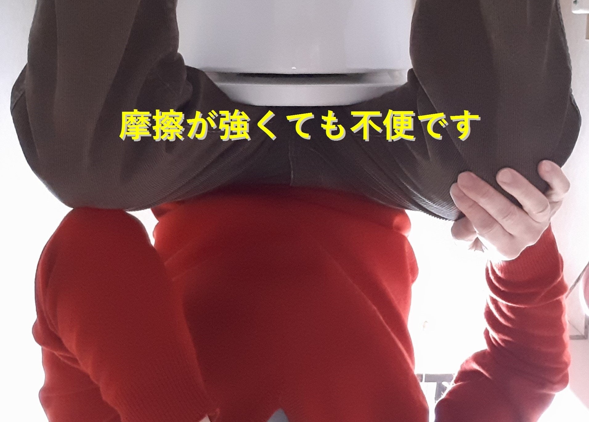 パンツのウエスト部分にはゴムが付いています。ゴムで押さえると考えないで摩擦力の強弱で支えていると考えてください。摩擦力がゼロだとするとパンツがはけません。落ちない程度の摩擦力で支えています。摩擦力が強くなるとどうでしょう?パンツが脱ぎにくいし、履きにくい。脱ぎやすい摩擦力と履きやすい摩擦力は同じなのか・・・?パンツの付属品であるゴムが履いた時に落ちない程度の摩擦力になる???不可能かな。。。
