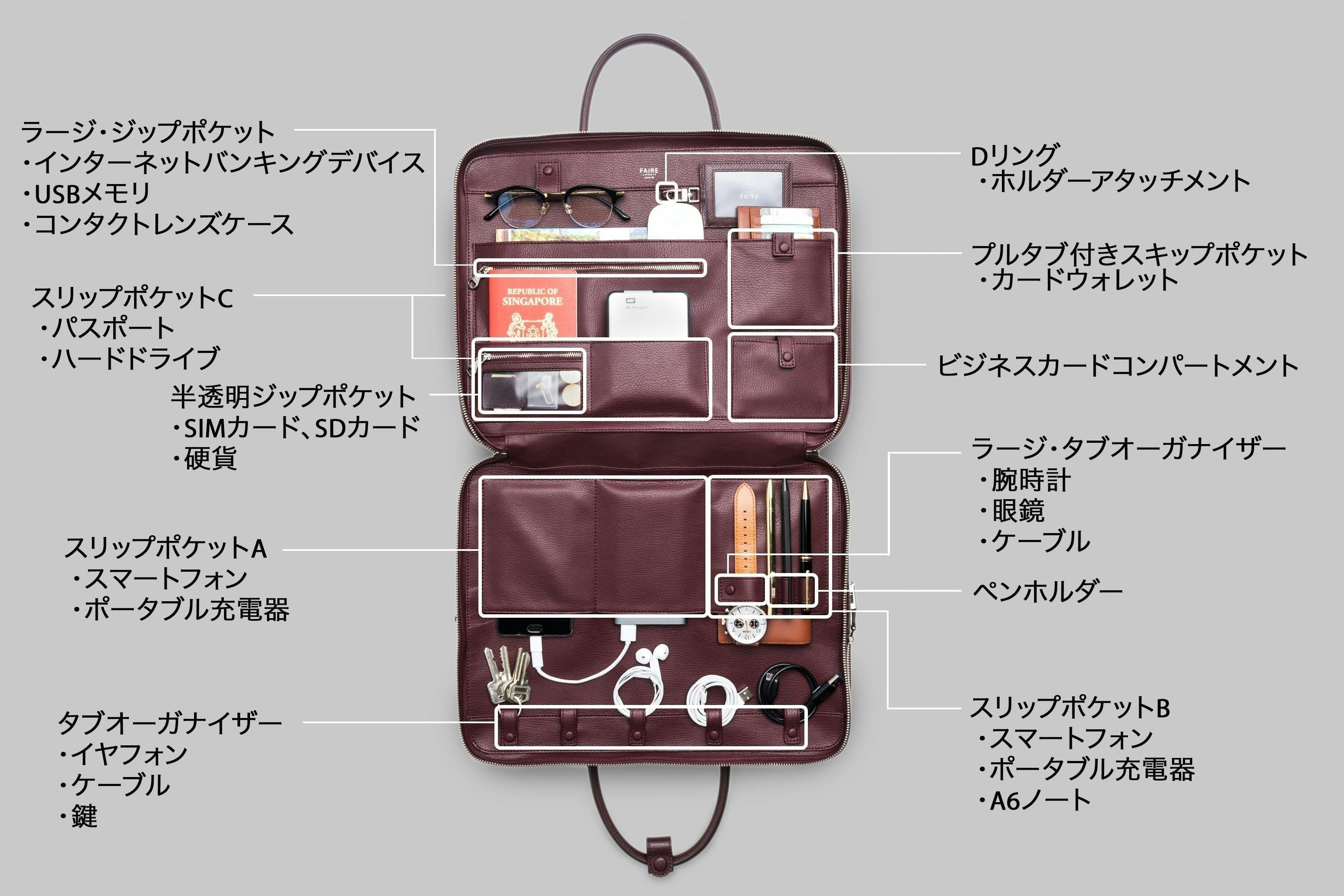 名刺入れ、キャリーバッグに装着するためのスロットスラップ、パスポート用ポケット、スマートフォンのSIMカードやSDカードを入れられる小物入れなどを備えています。