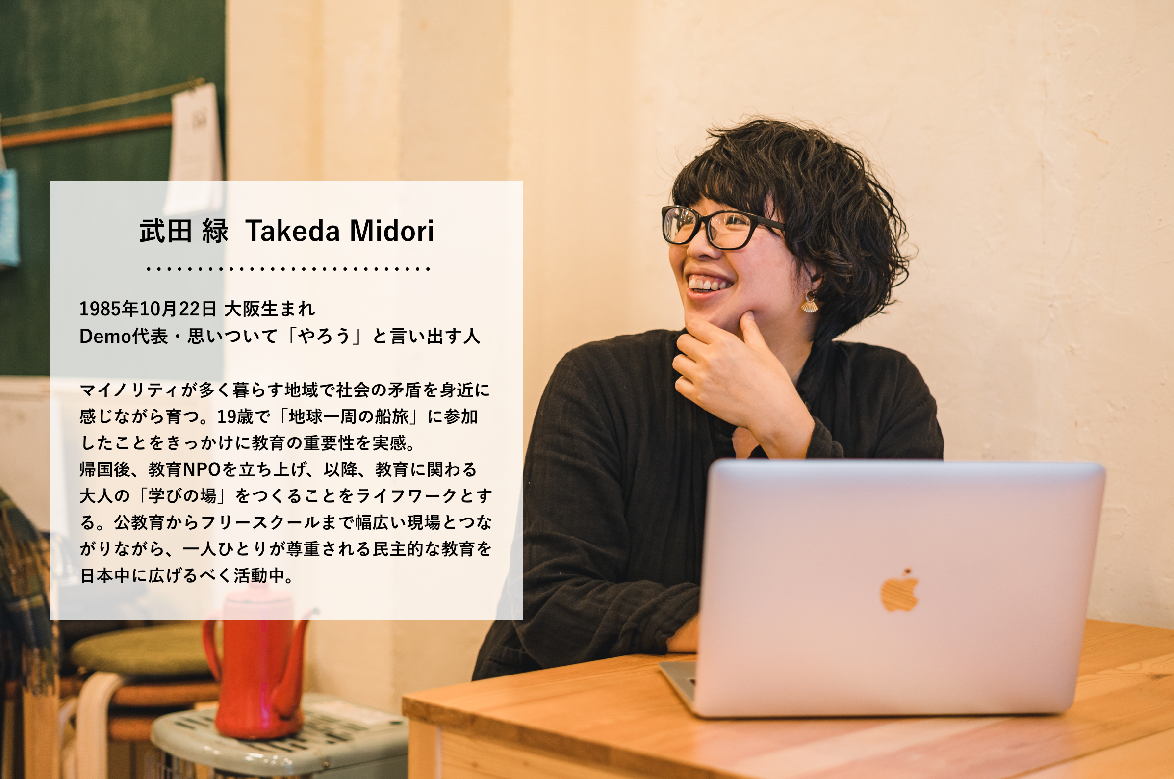 "行動力やスピード感はあれど、抜け漏れが多くて飽きっぽく、でこぼこの激しい私という人間を、Demoのメンバーが許して支えてくれてきた、この2年間。そのおかげで、本当にいきいきと動き回り、それまでと比べても、活動範囲を広げ、精度を高めてこれたと思います。私が社会に向けて発信できる、すべての活動の基盤であるこのチームが4月以降も存続できるよう、どうか力を貸してください。ーーー武田緑"