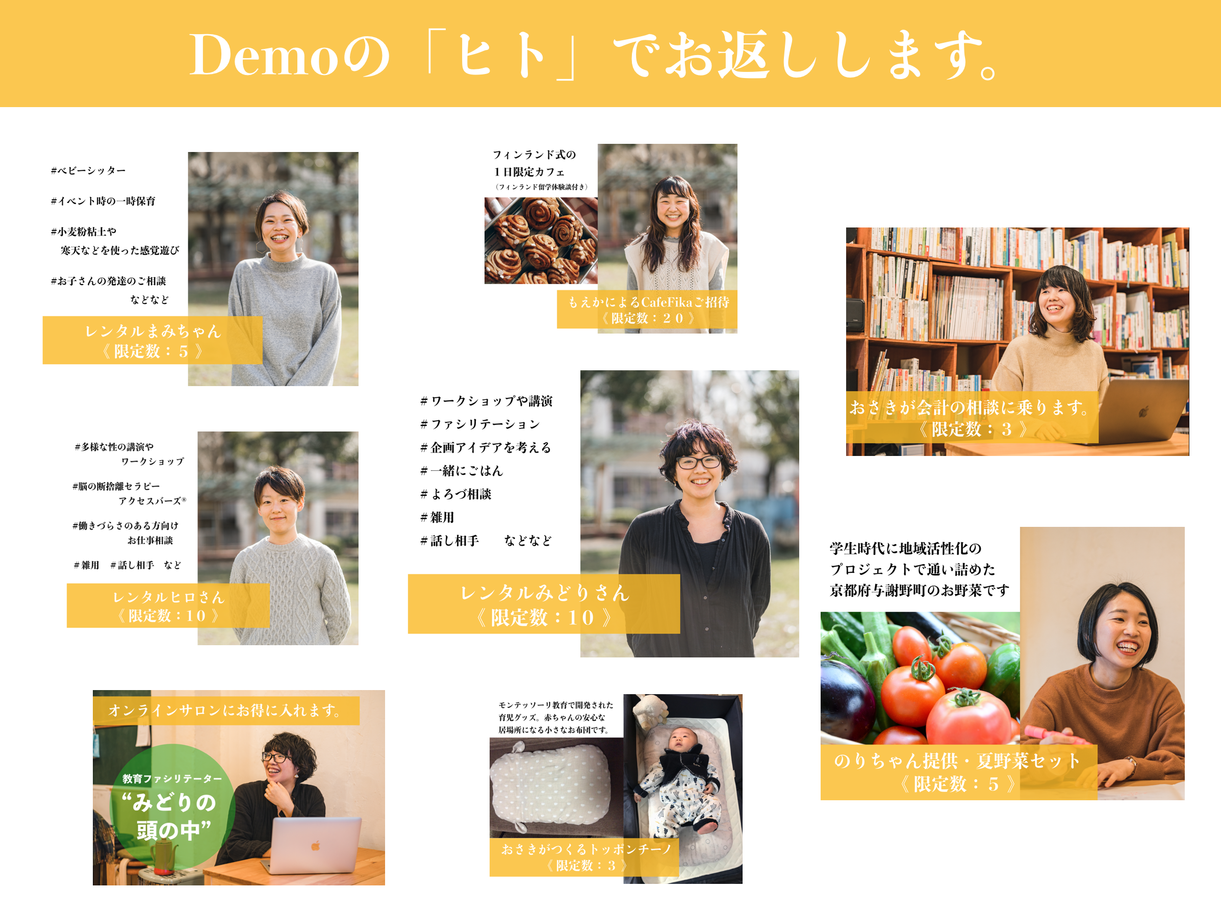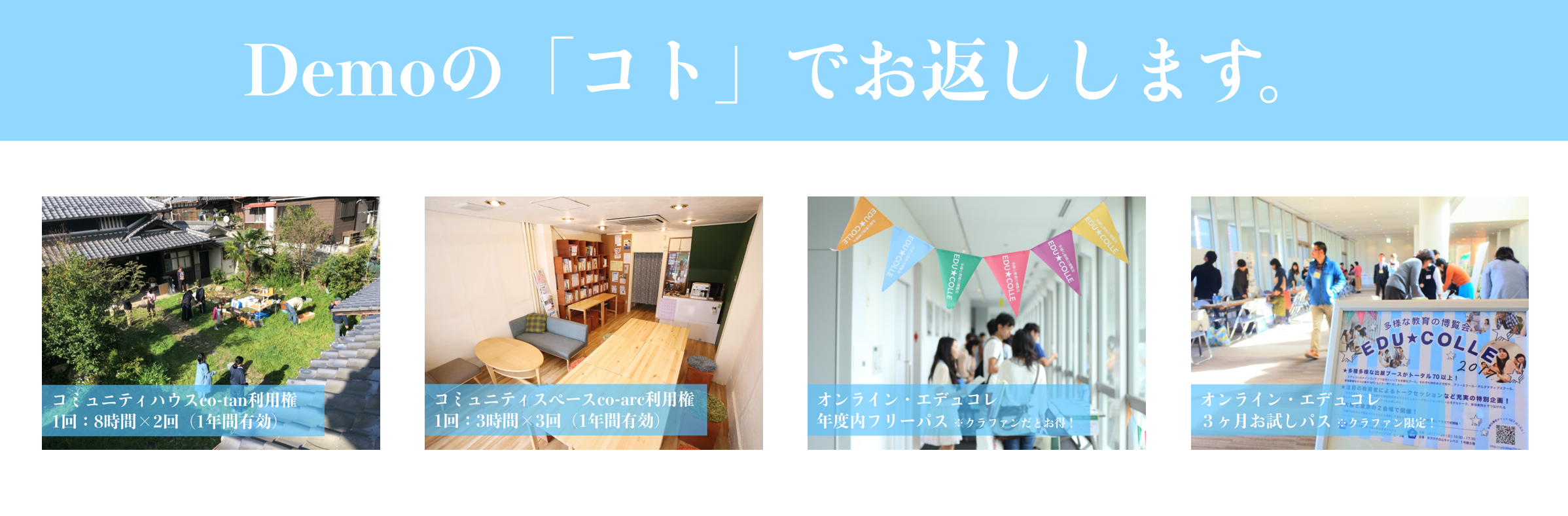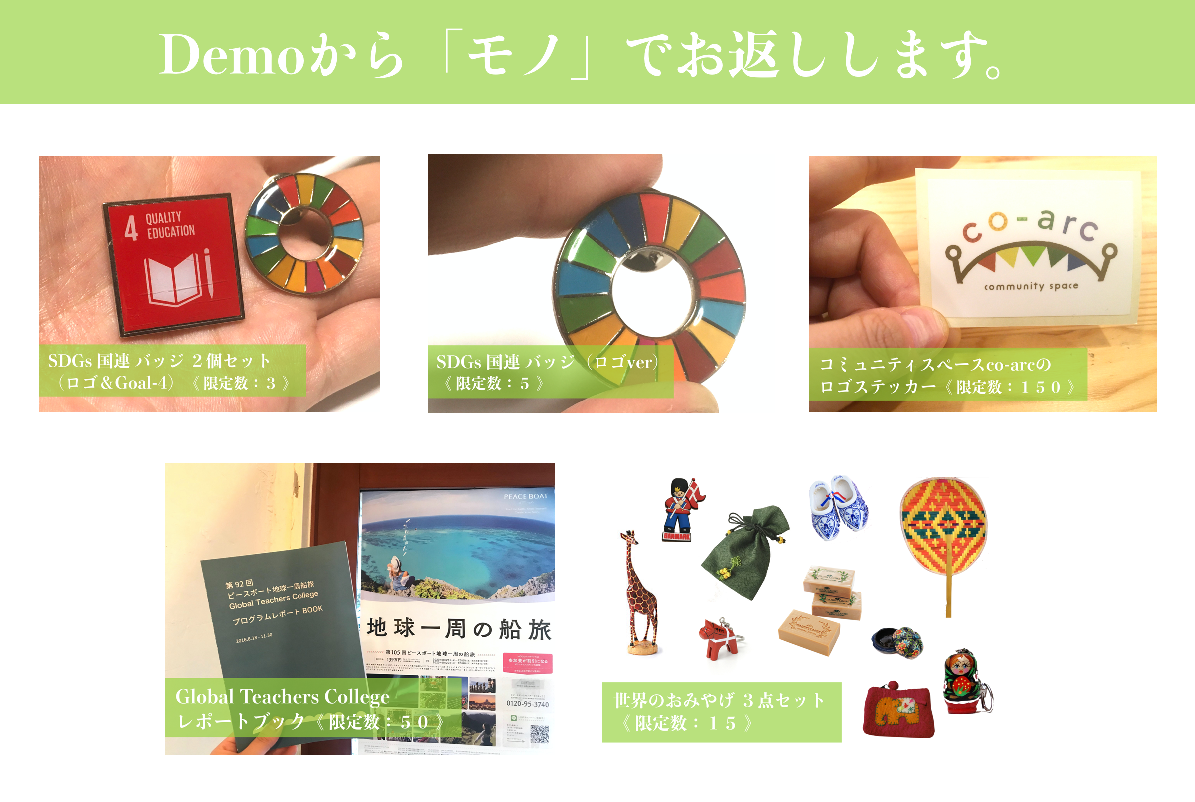 一方で、予期せぬ事態とはいえ、「単に支援をお願いする(こちらが受け取るだけ)」というかたちは本意ではありません。Demoのメンバーで知恵を絞り、「これは、いいやん」と思っていただけるようなリターンをなるべく多くご用意させていただいたつもりです。