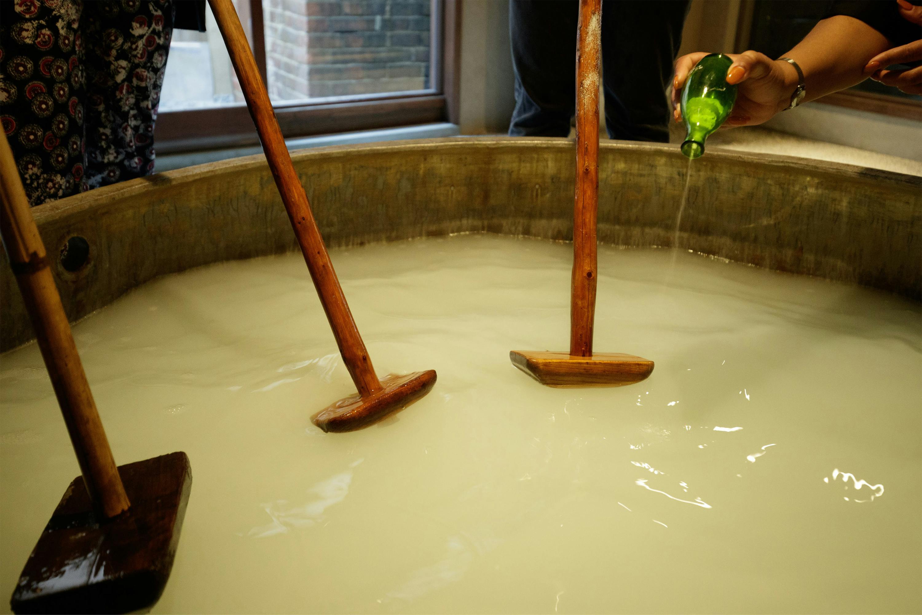 三豊鶴TOJIでは「入浴剤を大釜風呂に溶かす」工程を、「酒母造り」という酒造工程に模しています。