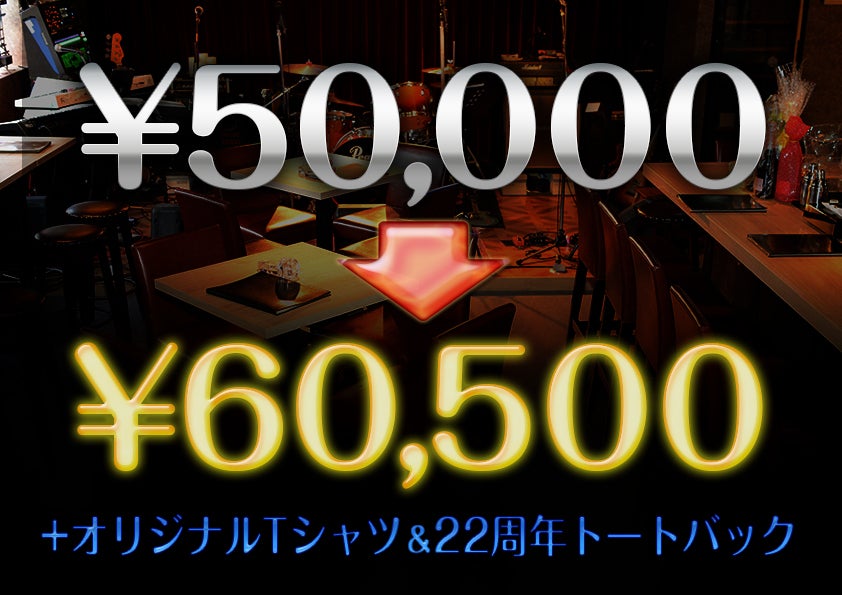 「50,000円分-飲食チケット」のお申し込みで、当店にて「5,500円」分(有効期限-2022年4月末日まで)ご飲食いただける「チケット×11マイ」(¥60,500相当)+「オリジナルTシャツ & 22周年トートバック」(Tシャツサイズに関しては、折り返し確認メールをさせていただきます)を、お送り致します。