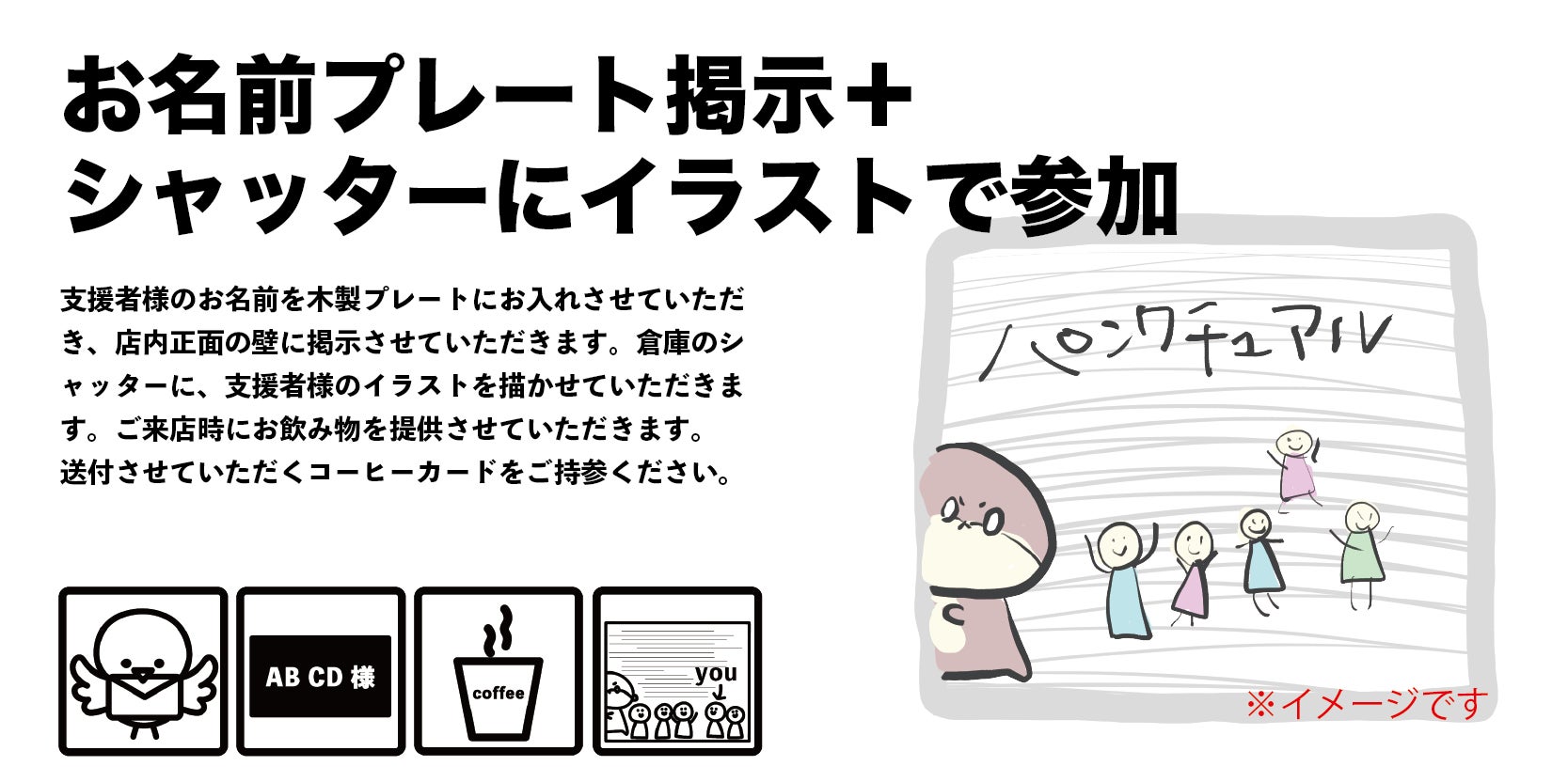 この、『シャッターにイラスト参加』にご支援いただきますと、期間終了後にパンクチュアルからメールをお送りさせていただきます。そちらの返信メールに支援者様の写真を添付いただくか、写真を送るのはちょっと。。。という方はフォーマットをご用意いたしますので、そちらに必要事項をご記入いただけましたら、その情報を元にこちらでイメージイラストをデザインをさせていただきます。