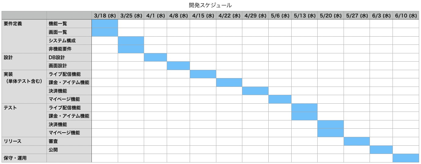 開発スケジュールは下図の通りです。3月18日から要件定義に先行着手しています。資金が集まれば4月1日より設計を開始し、6月リリースを目標とします。実装は2人のエンジニアが画面とサーバを分担して進める予定です。