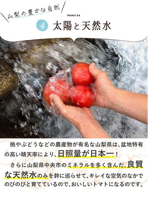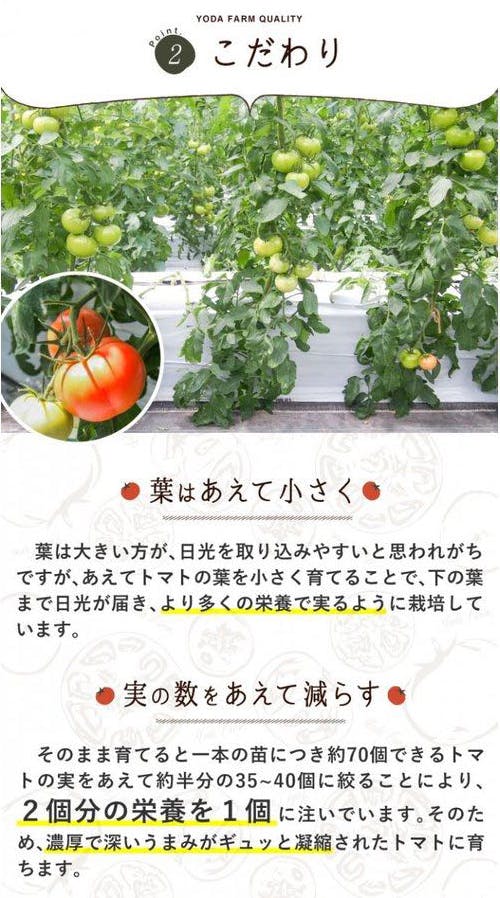 低農薬・たっぷり太陽と天然水の恵みを浴びて、熟年の経験に加え、テクノロジー(24時間コンピュータで栄養分・水分を徹底管理)を駆使し、「過保護」に育てられたヨダファームさん自慢のトマト。