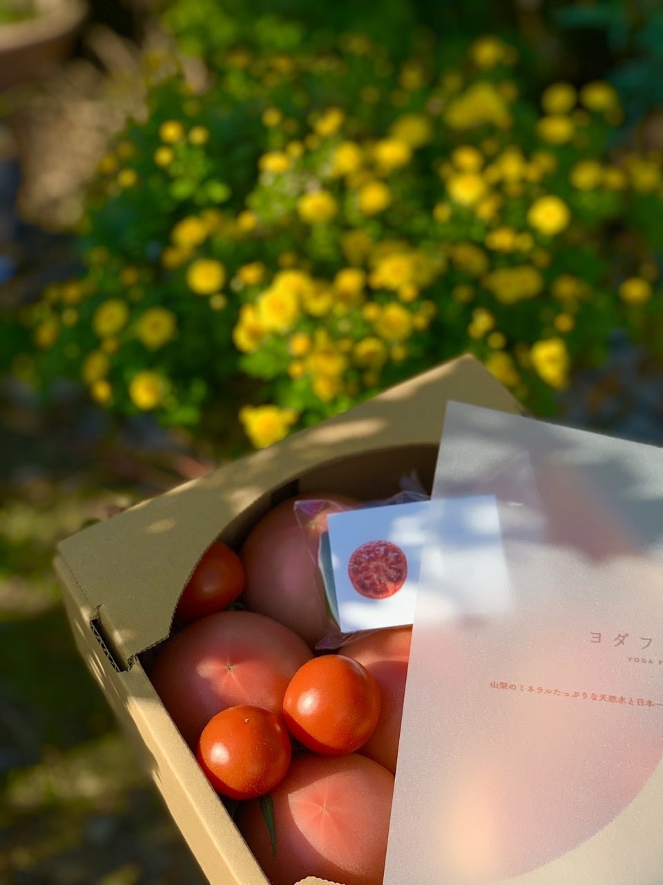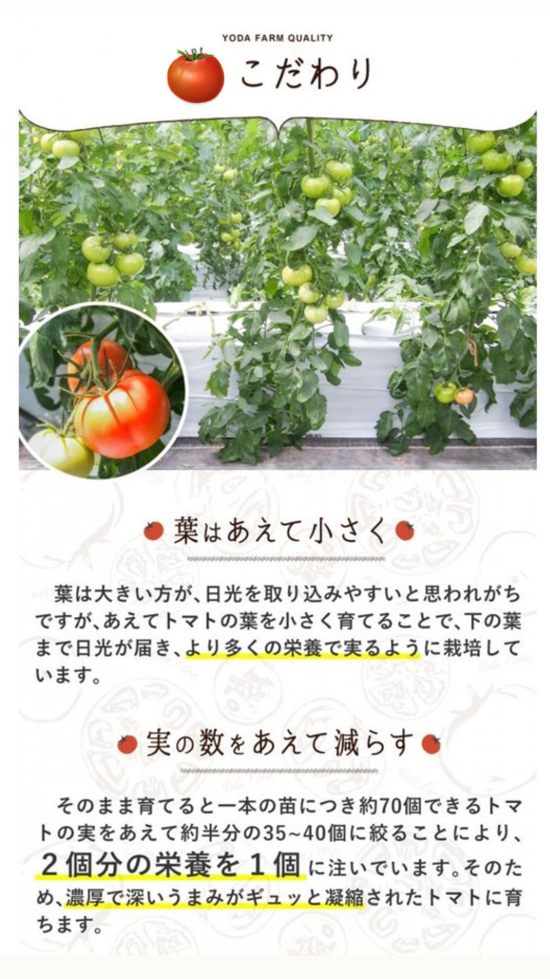 これから先数回に渡り、本プロジェクトのリターンでとなるヨダファーム様のトマトのご紹介をいたします!まず第一回目は栽培のこだわり!目から鱗の内容もございますので是非ご覧下さい!トマト好きな方は必見です!こだわり①大きく育ちたがる葉を厚く小さく育てる!家庭菜園をされた経験がある方は「え?小さく?」と思われるかもしれませんが、植物はどんな大きな葉であろうと1枚の葉ができる仕事量は変わらないんです。これすなわち、小さくて質の良い葉にどれだけ日を当てれるかが味の明暗を分けます!一口に小さく育てると言ってもこれもまた簡単な事ではございません。稔枝(ねんし:枝をねじりストレスを与える事)をしたり水やりの調整で小さく厚い質の良い葉を数多く作ります!②摘果で選抜生き残るのは約半分花が咲いた段階位でこの先美味しい実になるか否かを判断し、美味しくなる物のみを残しその他を摘んでしまいます。この判断が非常に難しい!こここそ半世紀の経験を生かし他ではおそらく真似できない技術になります!