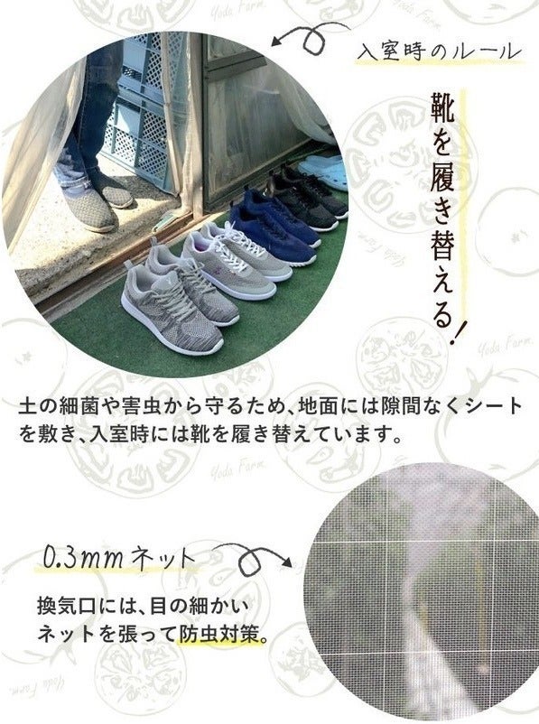 コロナウイルスが猛威を振るう中いかがお過ごしでしょうか?本日はヨダファームさんのこだわりの第二弾!外部からの雑菌や害虫には細心の注意を払います!ハウスに入る前に二重扉があり、そこで靴を履き替え、外の土や泥から隔離した状況をつくります。また、設備の方では一般の家庭の網戸が、約1ミリ〜2ミリなのに対し、私たちのハウスにでは0.3ミリのネットを使用しております。実は、以前はこのネットは家庭用の網戸だったり、0.5ミリ間隔くらいのものを使用していました。しかし、人間で言うと、最近生まれる子どもは「親知らず」がもう生えてこない様に、虫側もネットをすり抜けるれるように小さくなるよう進化しております。そんな事もあり0.4ミリ・・・0.3ミリと常に害虫も気にしながら設備のアップデートをしていかないとなりません。