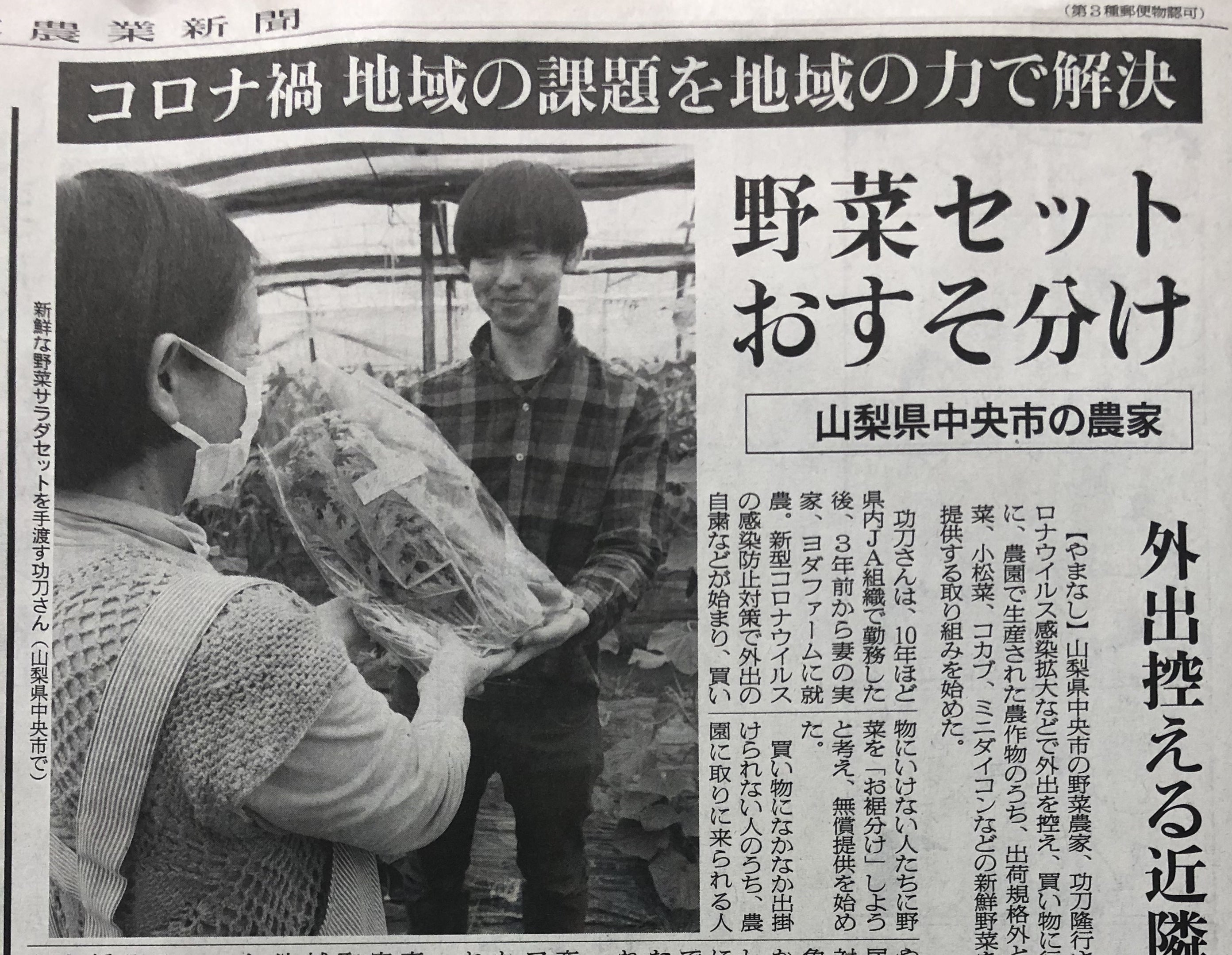 おかげさまで支援者数も少しずつ増えており、共感頂きました皆さまには心から感謝申し上げます。プロジェクト終了まて残り3週間を切りました、目標金額まではまだまだ程遠いですが目標達成の為、尽力していきます。さて今回は新聞掲載のお知らせ!今朝の日本農業新聞の朝刊で私たちの活動が掲載されました!色々な話題が尽きない中、私たちの活動を大きく掲載頂きありがとうございました。