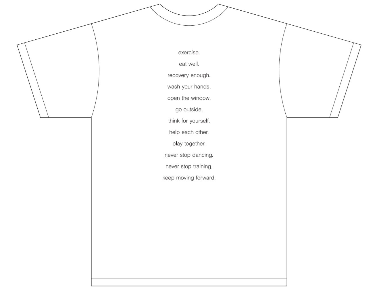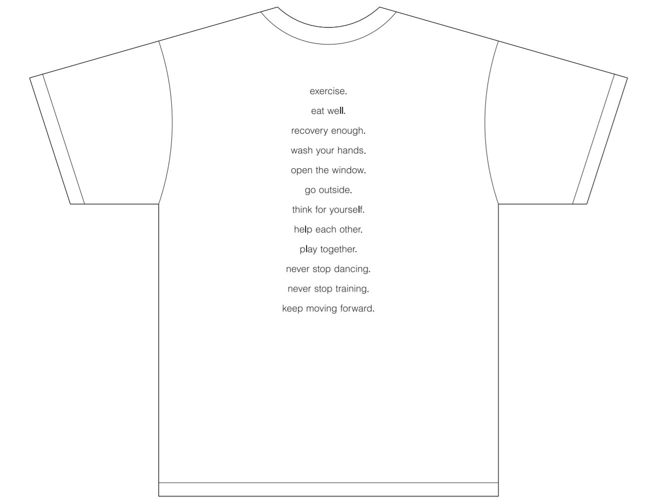 Tシャツの背中側では、“eat well.”“wash your hands. ”等、個人の方にご自身で取り組んでいただけることに加え”never stop dancing.” ”never stop training.”等のメッセージも含むデザインとなっています。前向きなコミュニケーションにぜひ役立ててください。