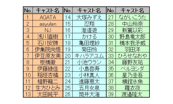 それぞれこの下の香盤表およびキャスト一覧をご参照いただき番号を備考欄にご記入ください。