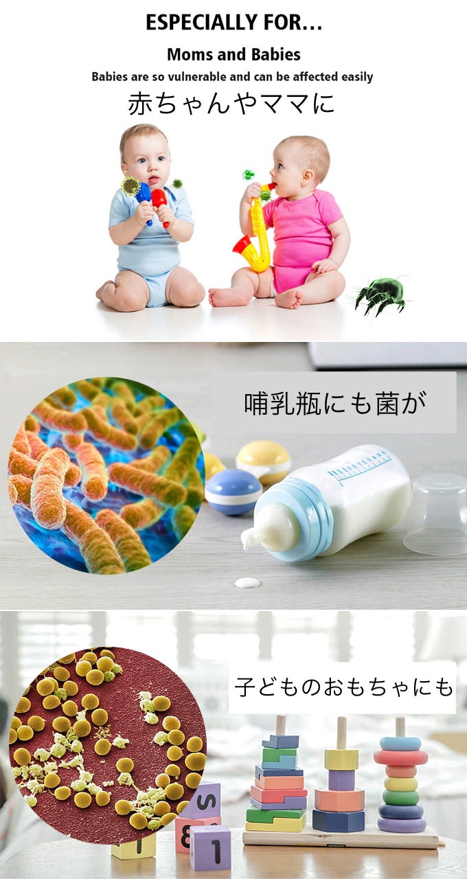 歯ブラシには約1000万個もの細菌(バクテリア)が付着している、という事実をご存知でしょうか。枕や布製品、靴の中にも潜んでいますし、赤ちゃんのタオルや洋服、哺乳瓶、おしゃぶりは唾液によってたくさんの菌が繁殖し、知らない間にその菌が体内に取り込まれているのです。