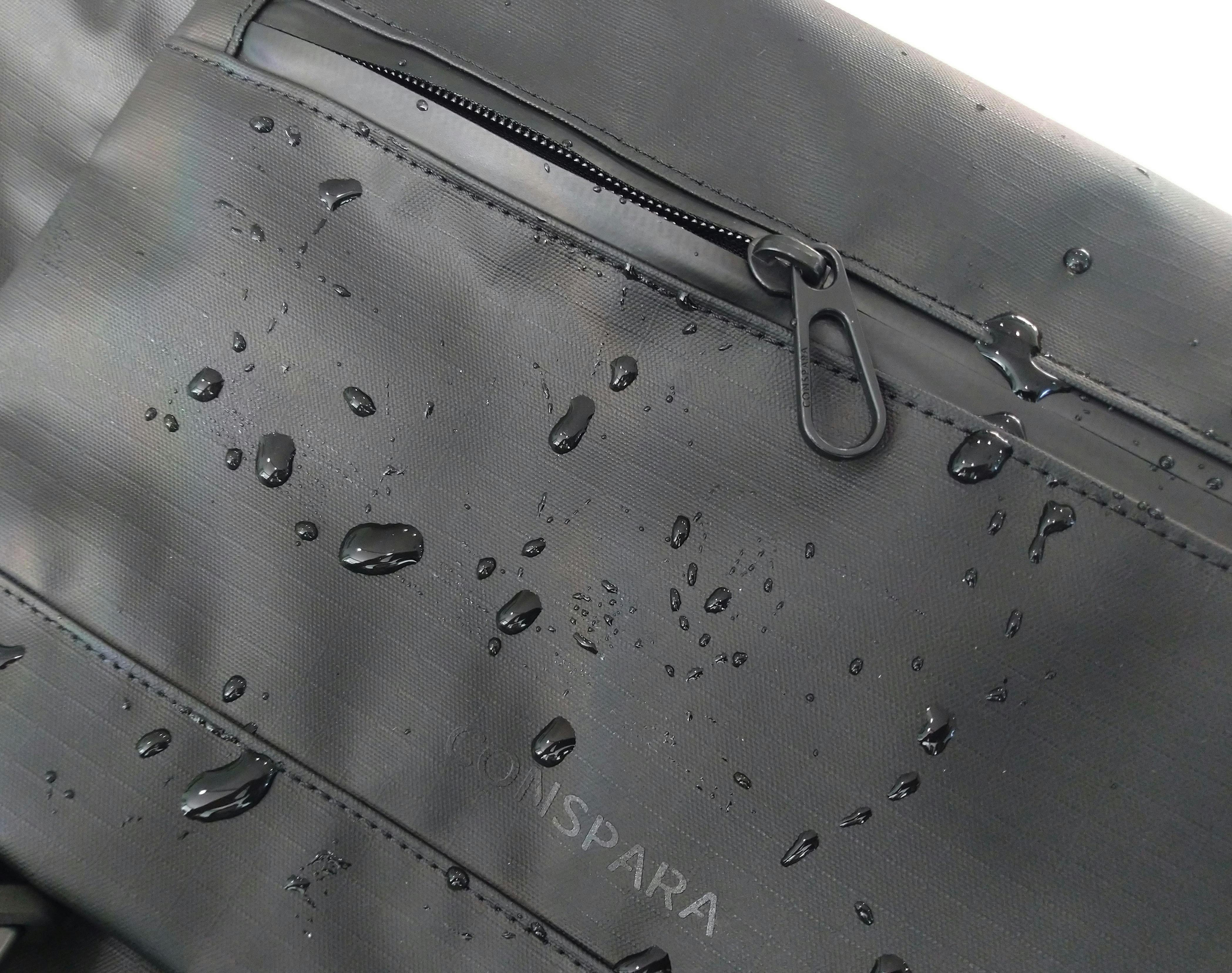 CORDURA®の防水生地と、止水ファスナーが外出先での突然の雨・スコールからバッグの中身を守ります。