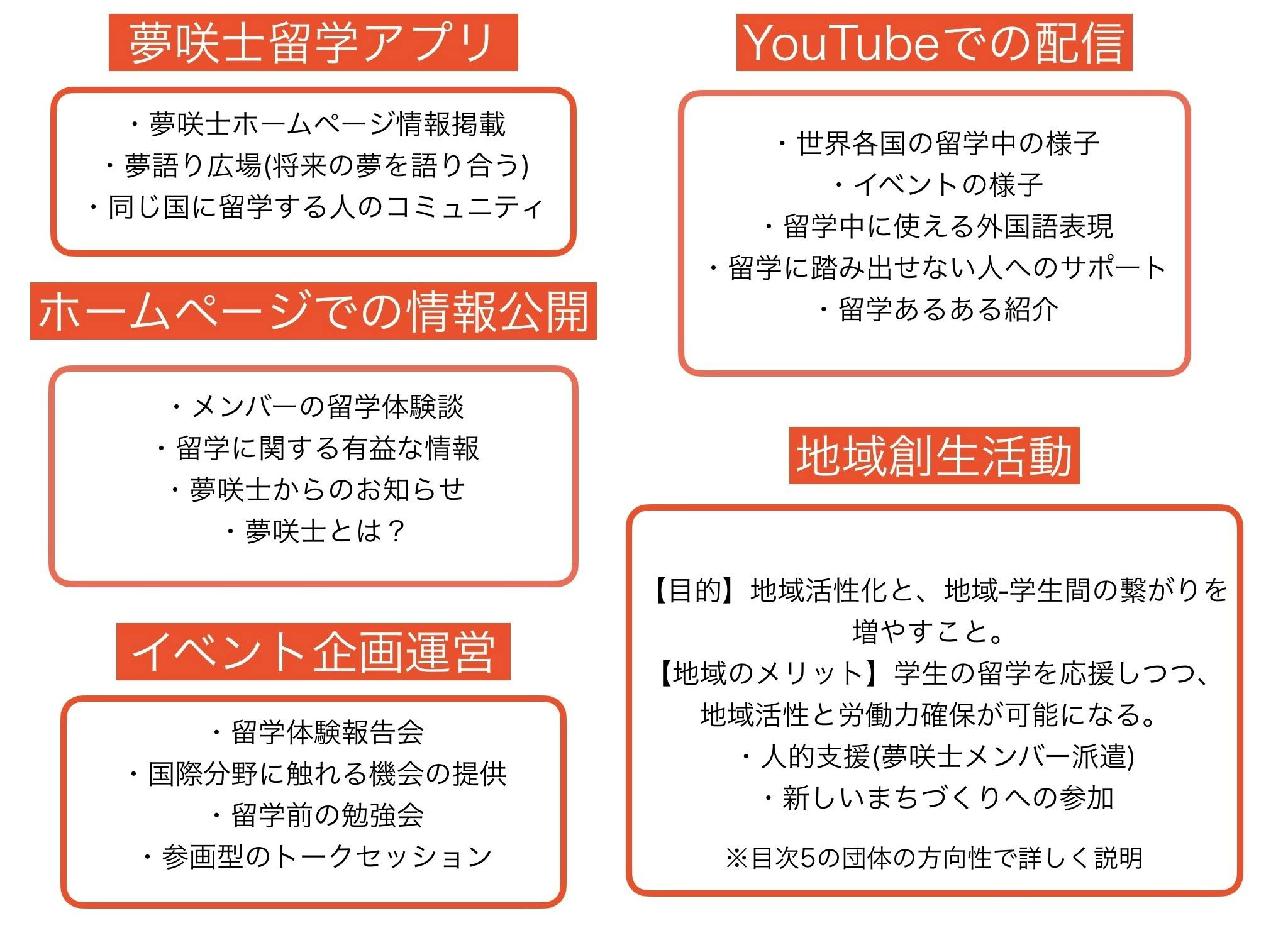 夢咲士は以下を収益活動として実践します。※ただし地域創生活動は留学支援体制②にも紹介がありますが、目学生コミュニティの拡大と地域活性化を目的としています。