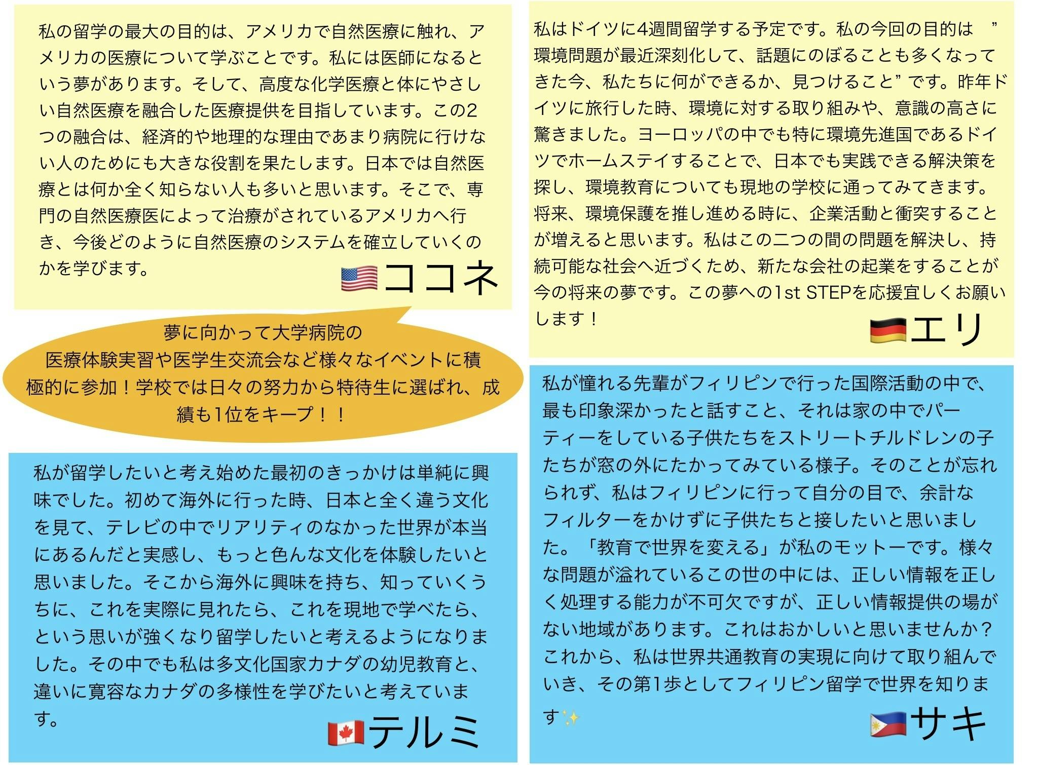 チームごとに色が分かれていますので「この子の留学を応援したい!📣」という方は、そのリターンを選択してください✨ 留学に向けても、夢を叶えるためのアクションにも、帰国後留学支援に全力を費やすためにも、各自で日々たくさん努力をしています!私たちを応援してくれると嬉しいです!