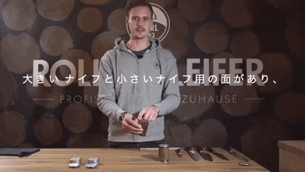 一方、ROLLSCHLEIFER(ロールシュライファー)は、ナイフを固定し、研ぎ器(グリップローラー)を動かすことによって研ぎます。