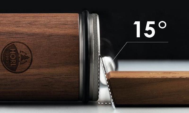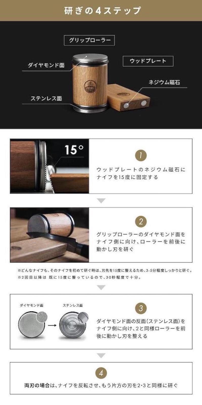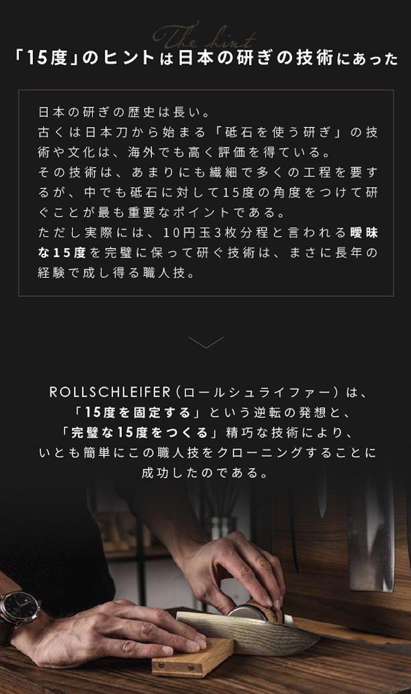 15度の角度には理由があります。欧米のナイフと日本の和包丁は、その歴史も素材も用途も違うが、実は、ほとんど全ての刃物は13-17度の角度で作られている、と開発者は言います。 故に、どんな刃も「15度に固定して研ぐ」ことが、安定的、且つ鋭い刃先を作るという目的を果たすために、最も効率的で、長い歴史で培った日本の研ぎの技術がそれを証明しています。