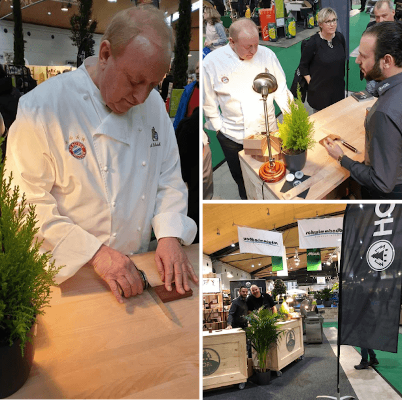 HORL-1993は、ROLLSCHLEIFER(ロールシュライファー)のブランディングのために、年間40以上の展示会へ出展してします。2019年3月、噂を聞きつけ、ついに、ドイツでは その名を知らない人はいないと言われるほど著名なシェフ Alfons Schuhbeck氏(アルフォンス・シューベック)がブースにやってきました。