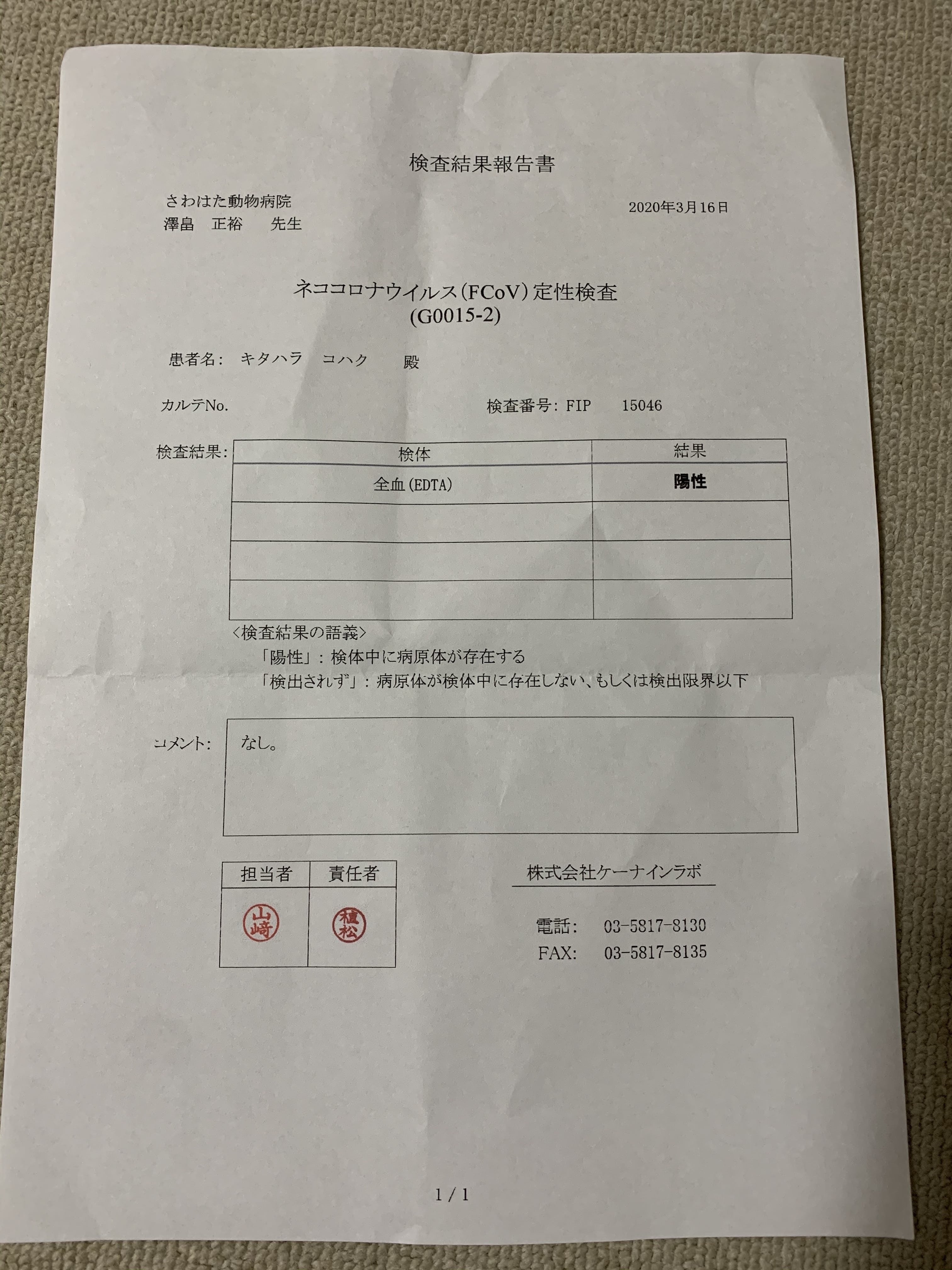 その後、血液検査の結果が出て正式にFIPと診断され