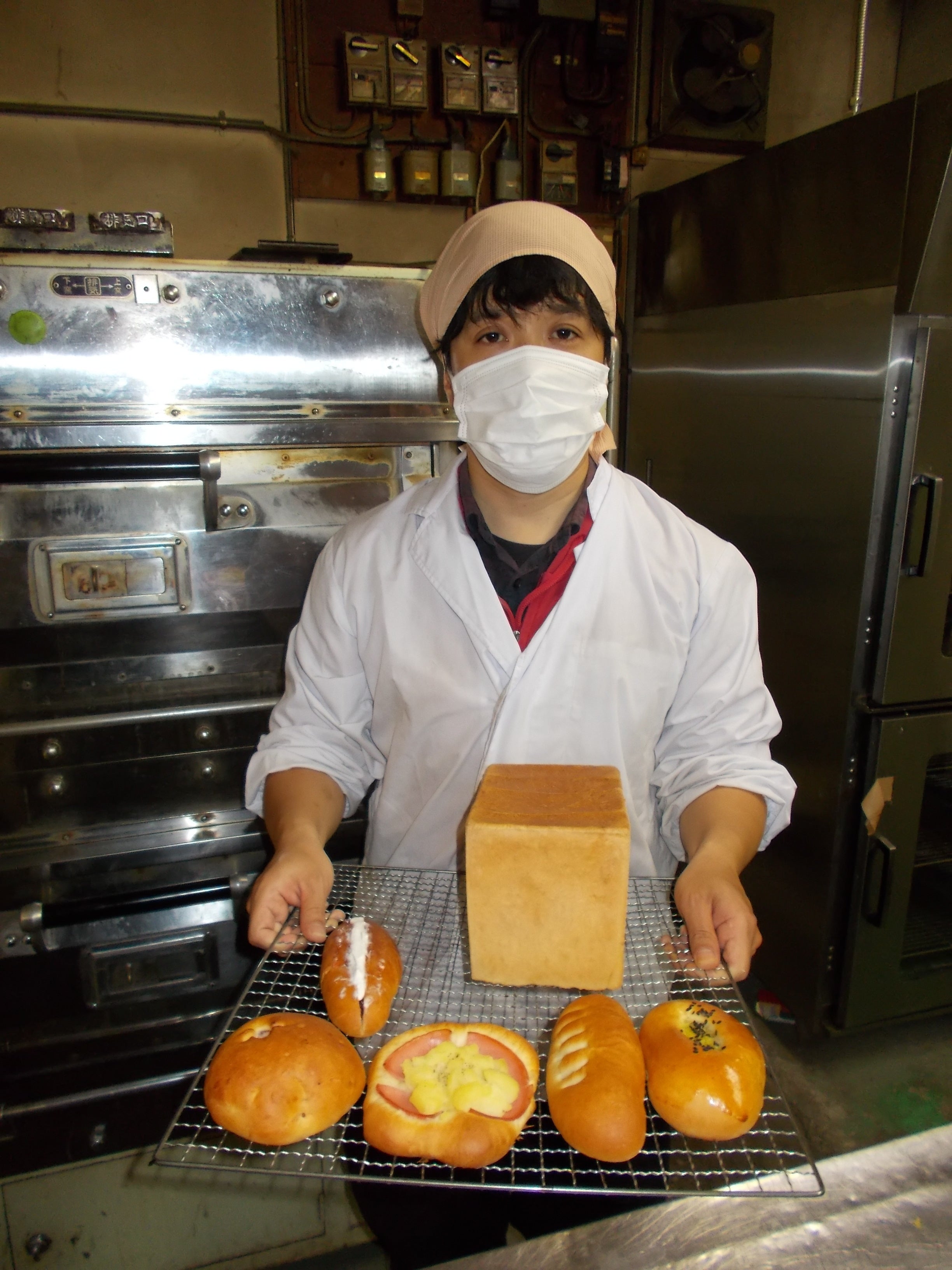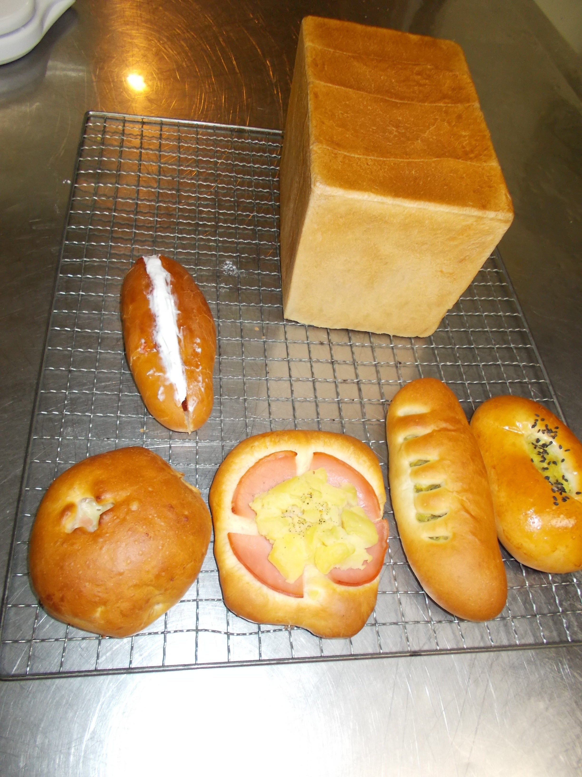 研究しているパンは、上から、生食パン、クリームいちごジャムパン、ハムじゃがパン1号、2号、スイートポテトパン1号、2号です。それからクロワッサンの生地作りにも挑戦しています。スイートポテトパンはその生地でパイのような食感を目指しています。再開まではまだ時間があるので毎日研究しています。