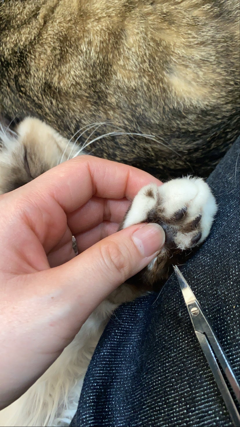 長毛種のソックスはフローリングで滑る事もたまにあったので、今日は初めてソックスの肉球の間の毛をお昼寝中にこっそりカットしました(*´`)