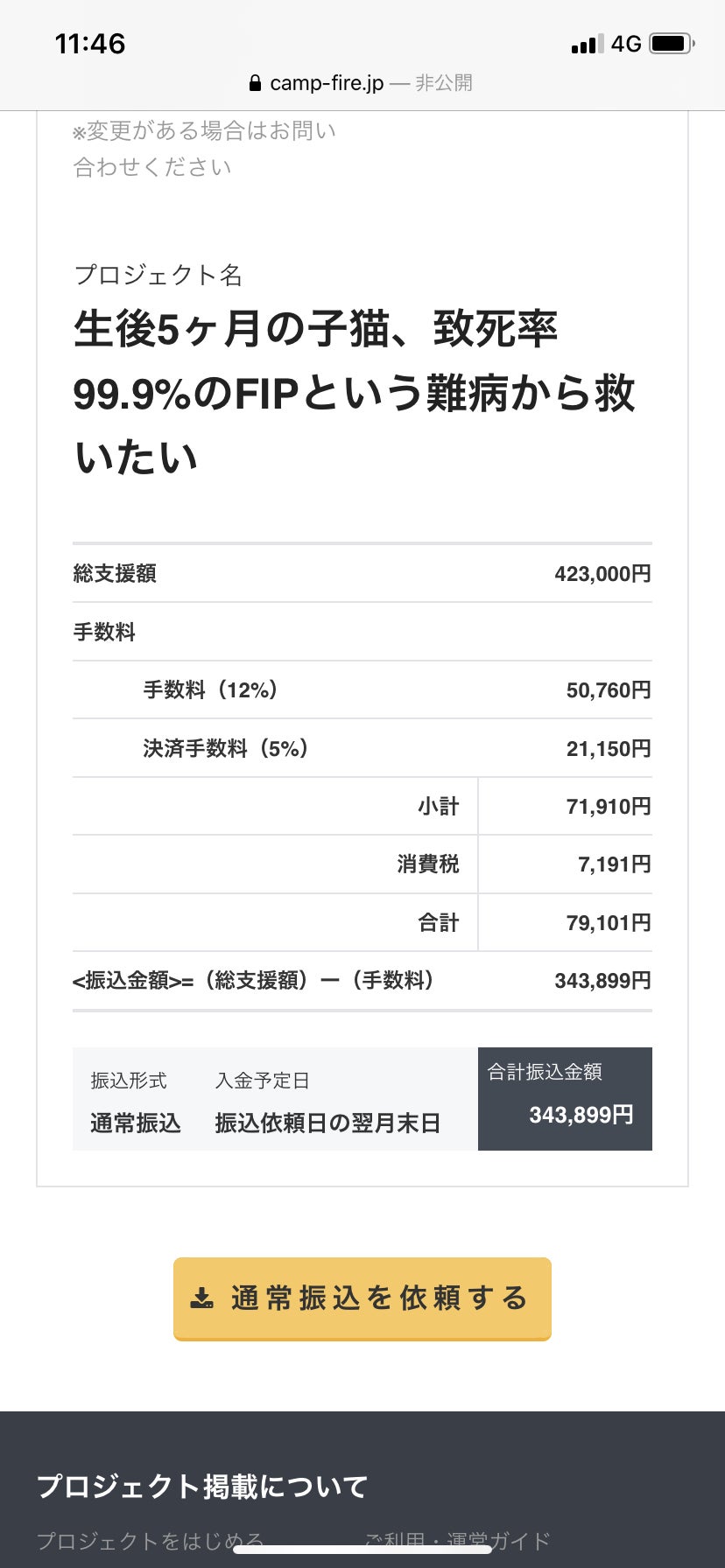 御支援頂けた額から手数料等をひいて343899円の振込になります!