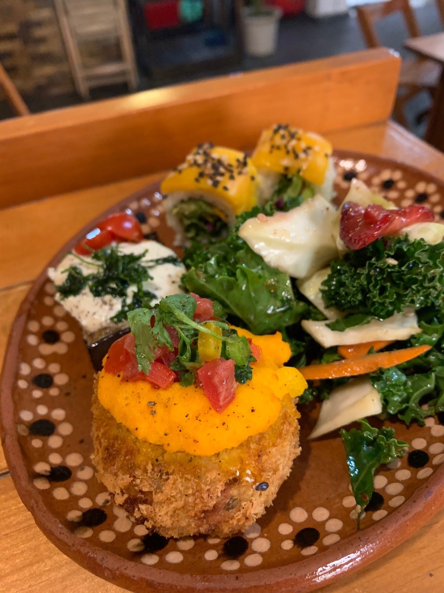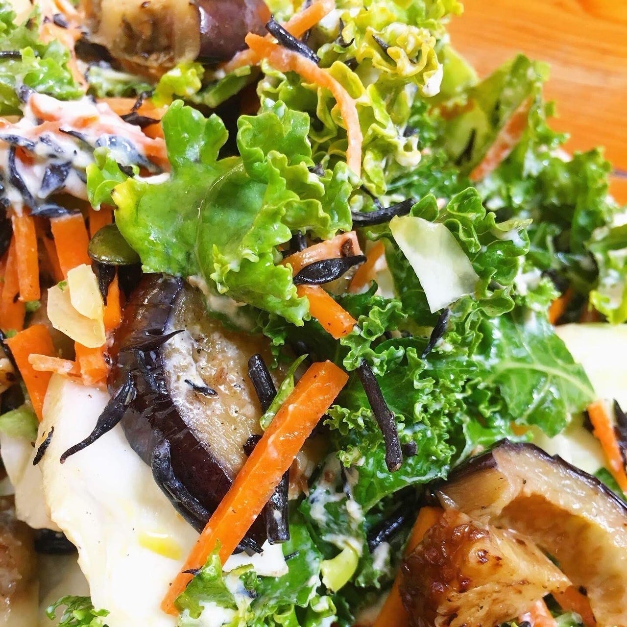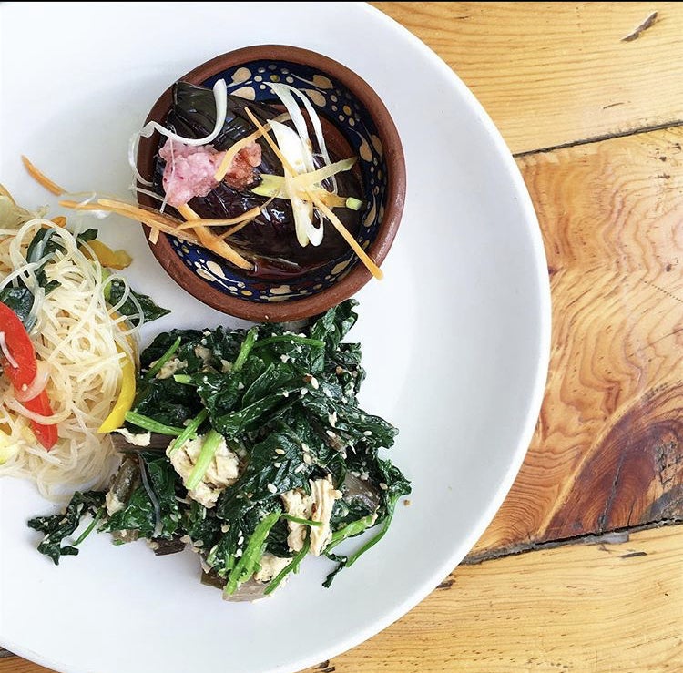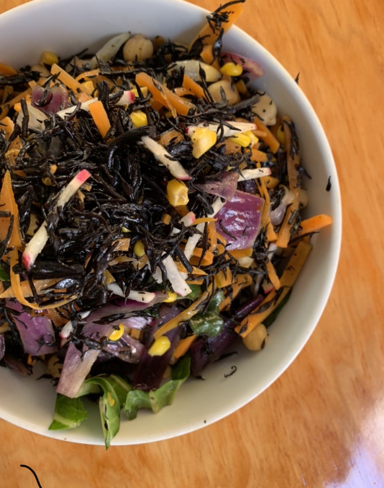 (ケールと焼き茄子、ひじきと豆腐の白和え風サラダ。メキシコでも健康志向の人が増えているのでとても人気の一品です。僕の得意技はこうした日本食材と現地の野菜を組み合わせることで、美味しさを増やすことです。)