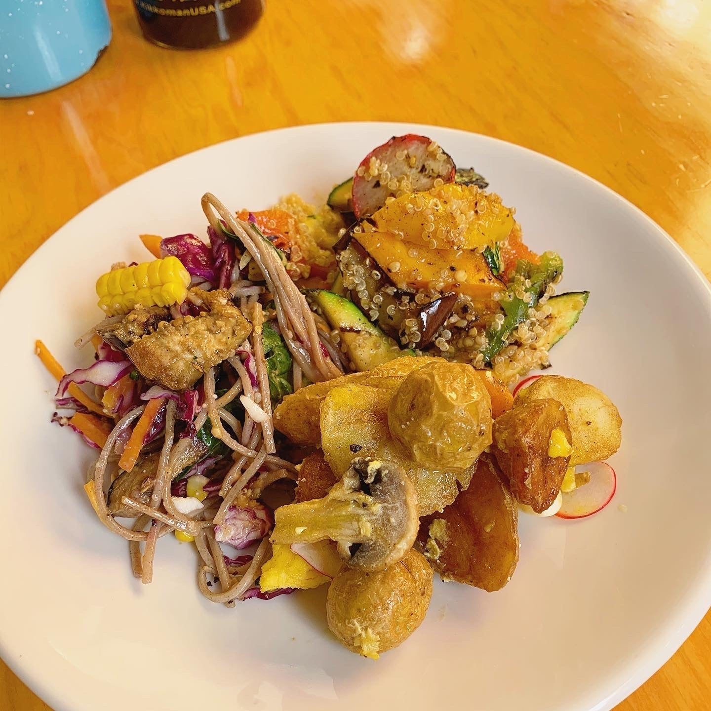【お客様が目でみて、好きなお惣菜を選んで食べるスタイルが大人気】(3種類のお惣菜デリプレート 蕎麦を使ったサラダやカレー風味の揚げじゃが芋、焼き野菜の甘酢和え)