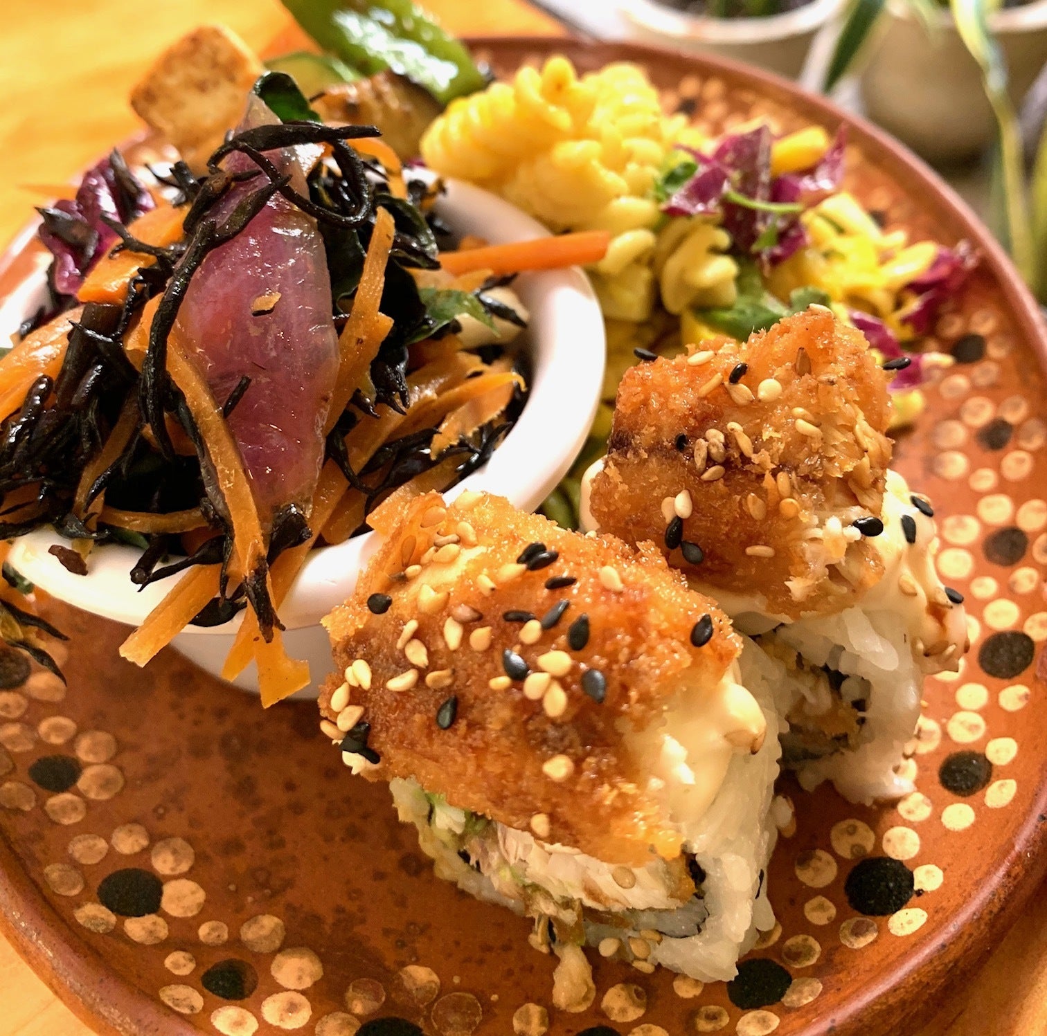 (日本のお客様には懐かしく、メキシコ人や欧米人には新しいそしてヘルシーな日本食として人気が出てきたデリカ・ミツの【ひじき】グァナファト州の民芸品であるタラベラ焼きに盛り付けて。カラフルな器と黒のひじきが美しいです。)2017年には日本のTV番組で、『海外で【ひじき】を惣菜を広める日本人』としても紹介されました。