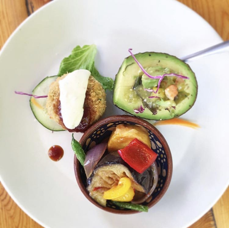 (右上から、時計回りで。。メキシコ人が大好きなアボガドにわさび風味のサラダを詰めて、茄子の煮浸しと彩り野菜、大人気のコロッケ) 好きな惣菜を3品選べるプレート。日本では良く目にするスタイルもメキシコでは当店が唯一です!