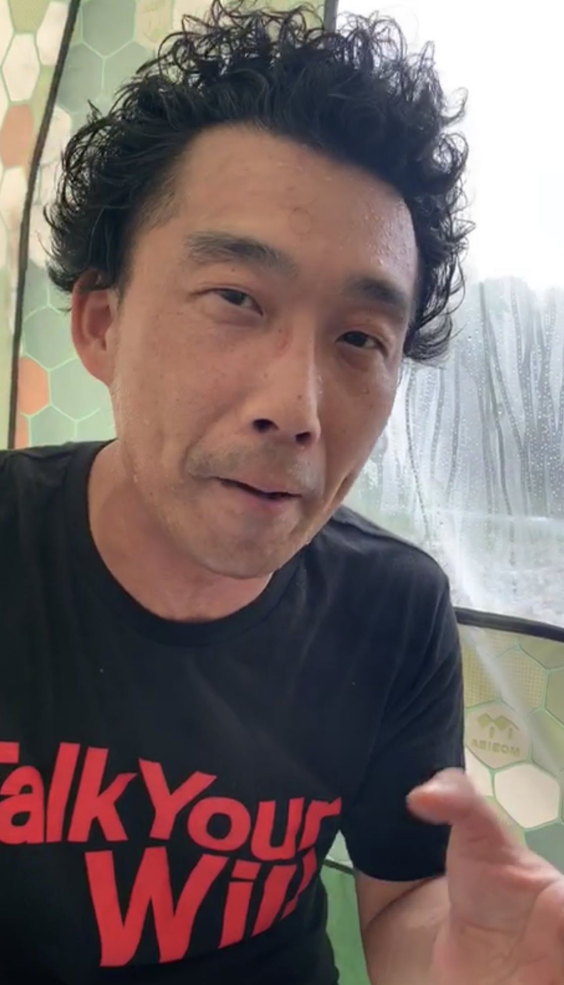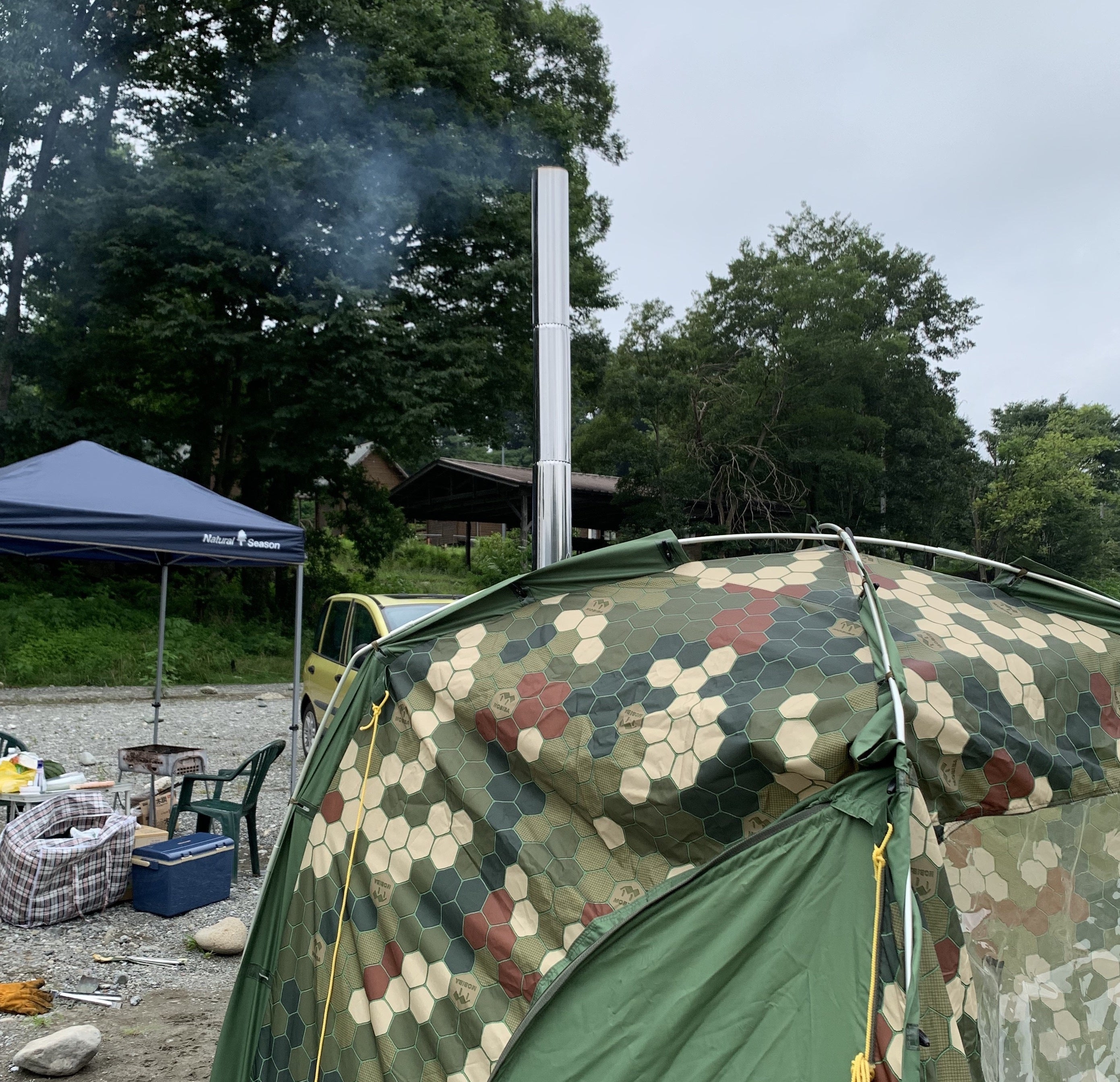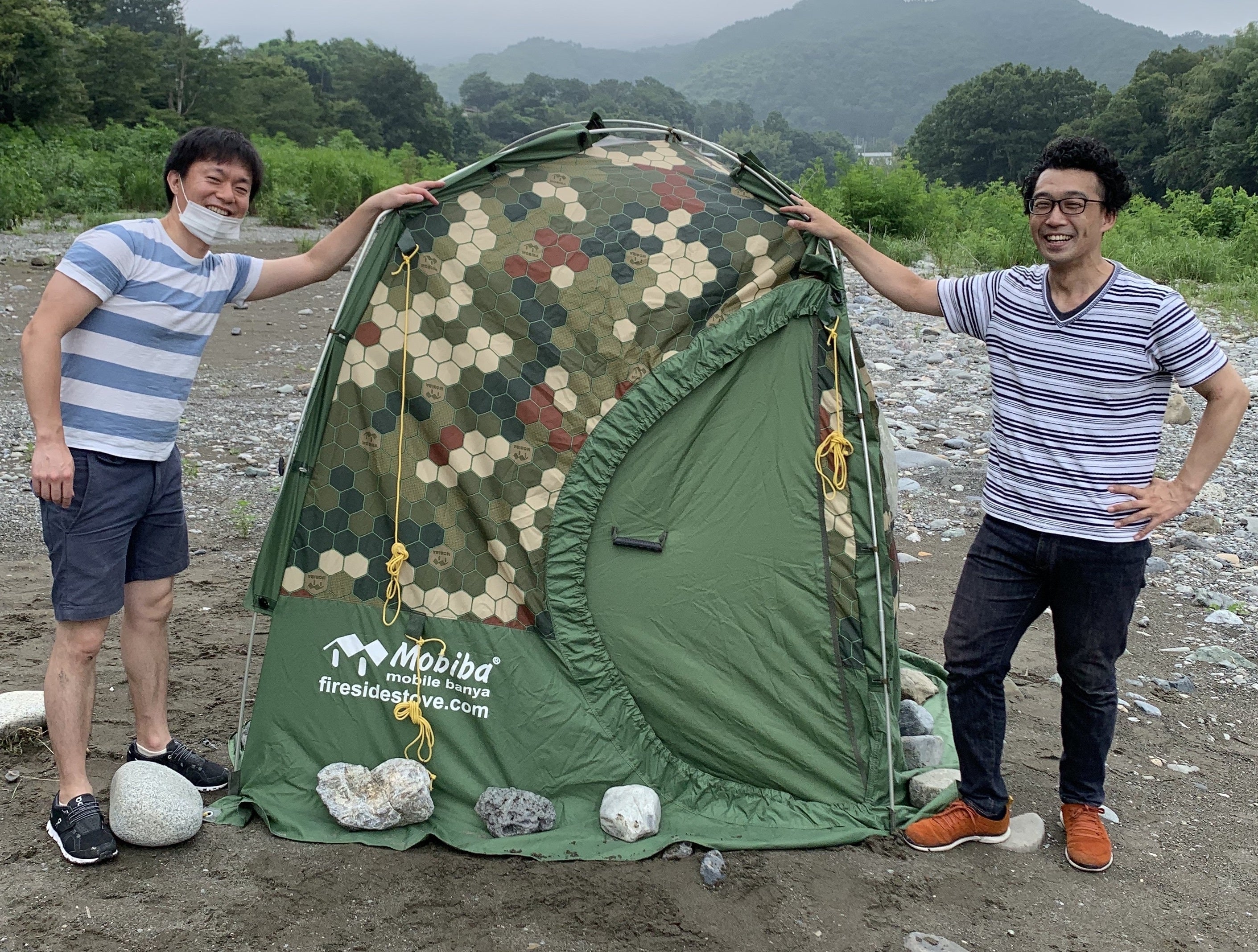 サウナテント完成。弊社サム広田もこのはしゃぎよう。