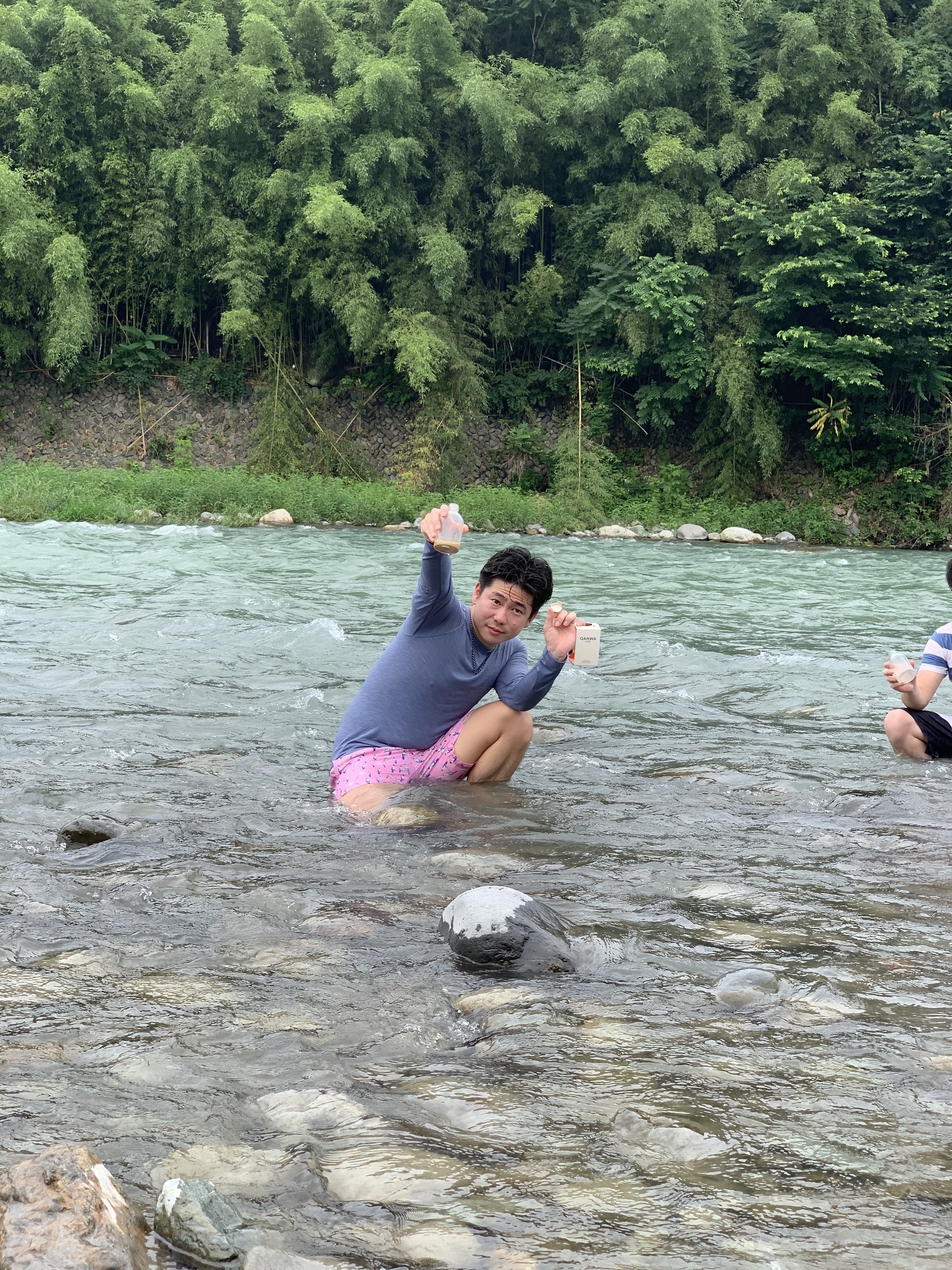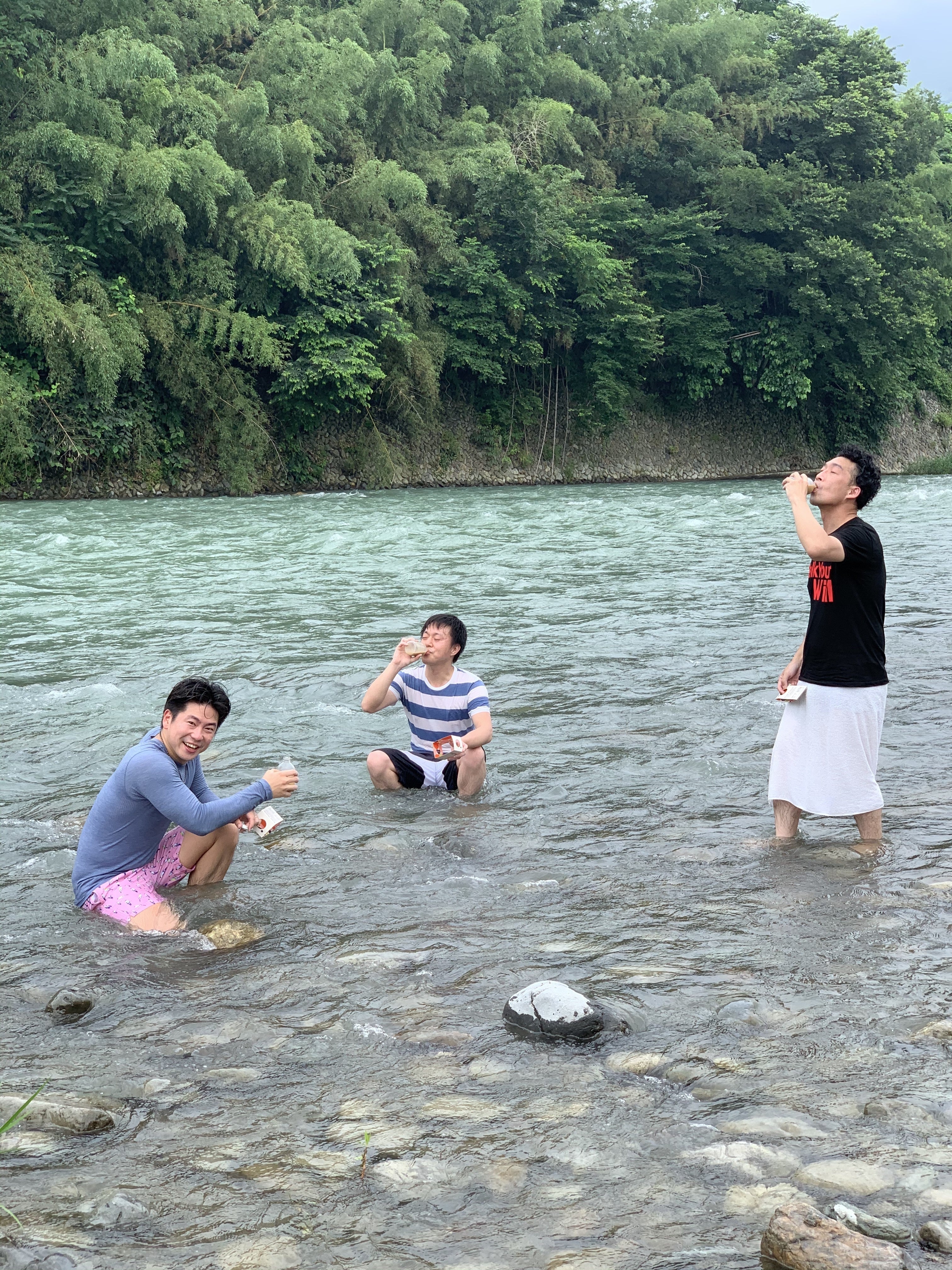 暑さに耐えて耐えて耐え忍んで、そのまま川にダイブ!極寒の冷たさでしたが、川の中でまさに「ととのった」後に飲むQAHWA MILKのうまいことうまいこと!