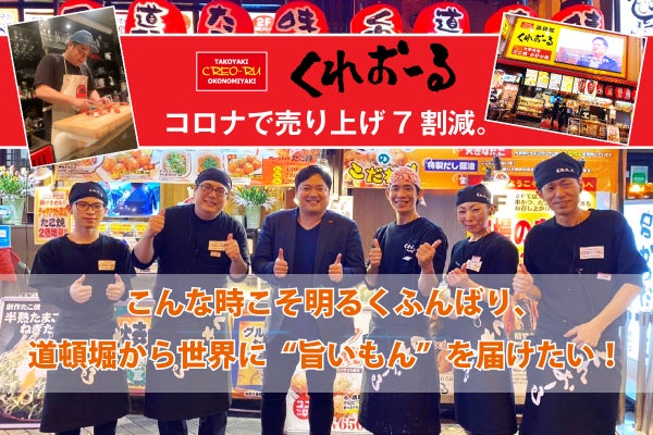 2月コロナウイルスが脅威になり、道頓堀の街からアジアの観光客の姿が消えました。3月、臨時休校要請があってからは「これが天下のグルメ聖地か」と思うほどに寂しくなりました。道頓堀本店の売上は3割に激減……。全国11店舗もあるじゃないか?と思われるかもしれません。しかし、今はどの店舗も苦しい状況で、家賃など大きな固定費を抱える本店の窮地を救うことはできません。道頓堀本店は、まさにくれおーるそのもの。これが続けば、本体ごと倒れてしまいます。そんな中でも、想いから集まってくれた従業員を切り捨てるようなことはできません。くれおーるは、アルバイトも家族。彼らの生活をできるだけ守ろうと、相当な無理をしています。「来てくれたら絶対に満足してもらえるのに、なんでコロナなんかに…」と、悔しさはあります。しかし、今は世界が手を取り合って、ウイルスに勝たなければならない時です。私たちは常に“焼き姿の華やかさ”にこだわり「食はエンターテインメント」と謳ってきました。泣くのではなく、こんな時こそ「元気にふんばること」を使命と信じています。
