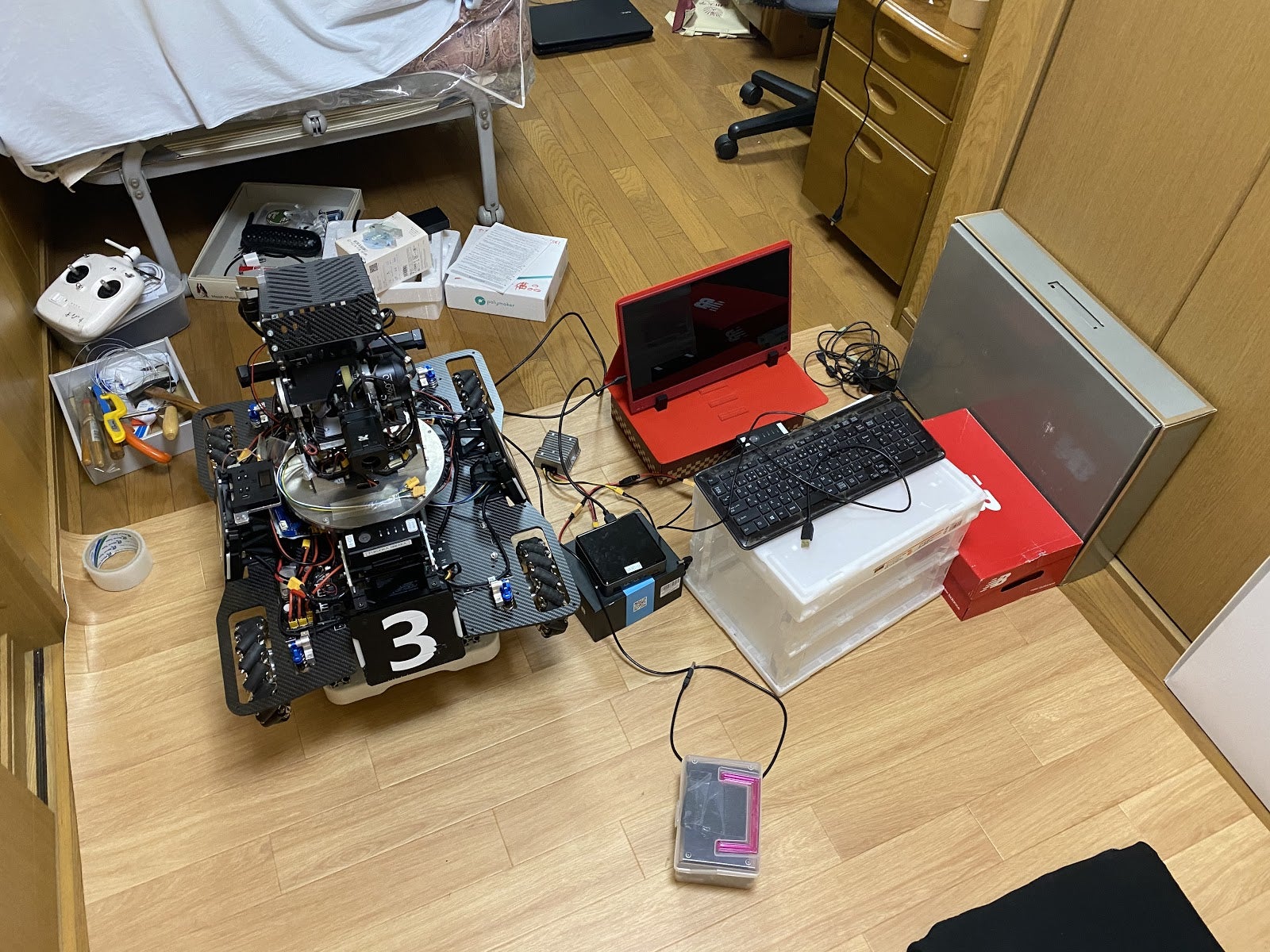 チーム内では、歩兵ロボットのプログラミングとチーム内のライブラリ作成を担当しています。新型コロナウイルスの流行により、活動拠点であるニワカラボに集まっての作業ができないため、歩兵ロボットを自宅に持ち帰り、開発を続けています。