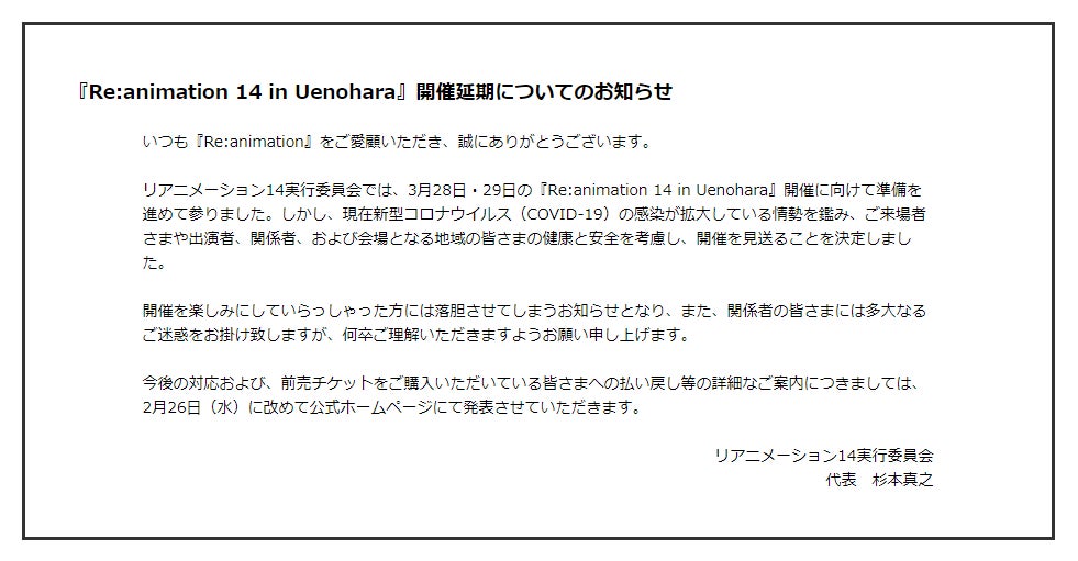 その第2弾として、更に力を入れて準備していた『Re:animation 14 in Uenohara』でしたが、新型コロナウイルスの感染が拡大する情勢を受け、2月21日に延期の判断を下しました。