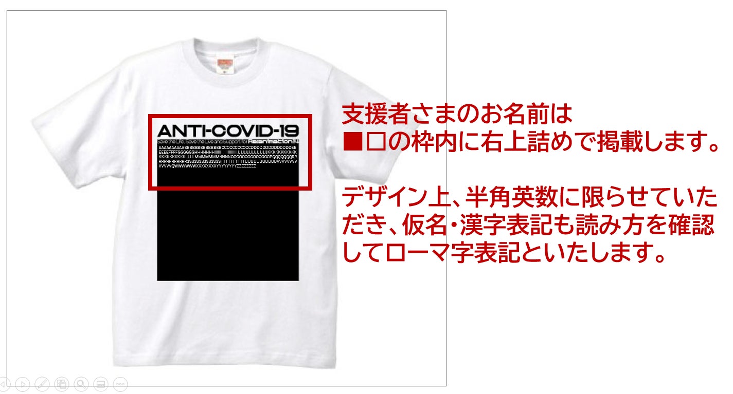 ※Tシャツのデザインはクラウドファンディングでご指定いただいた皆さまの名前を含んだデザインとなります。