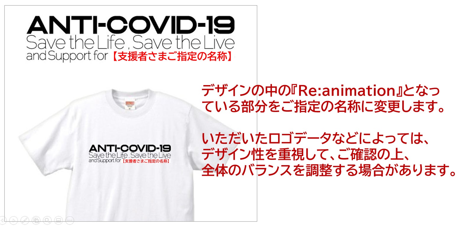 ※デザインの『Re:animation』の部分を任意の名称(ロゴ)に変更することができます。支援者さまより掲載したいロゴデータをいただき当方でデザインを変更します。ロゴデータがない場合は、テキストで掲載したい文言をいただき、デザインに落とし込みます。