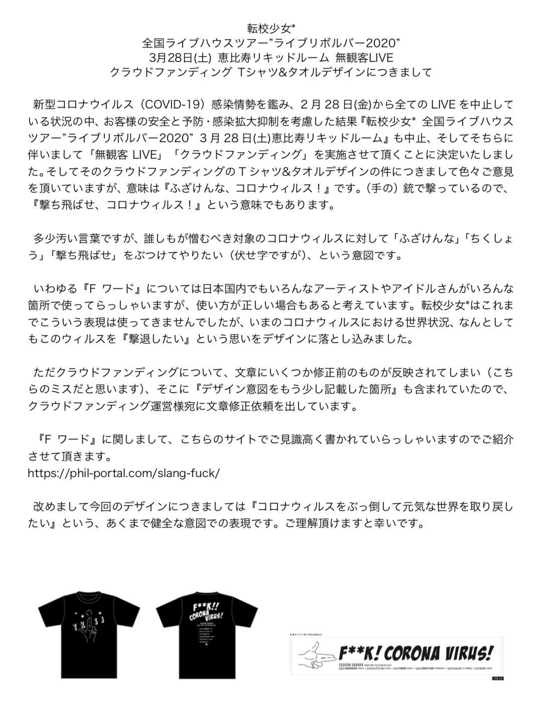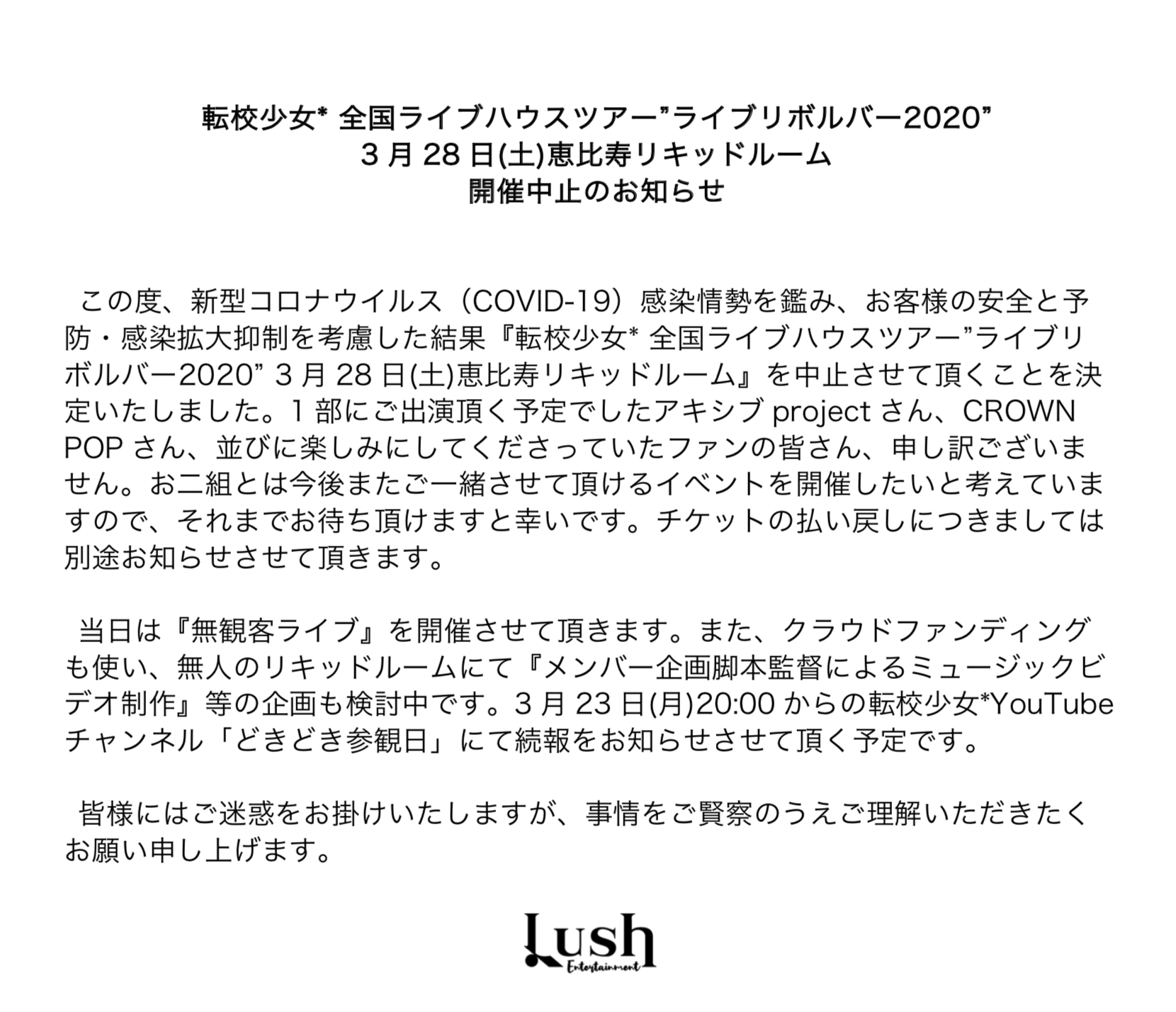 現在のコロナウイルスの状況を鑑みて、2020年3月28日(日) 開催予定の「転校少女*全国ライブハウスツアー“ライブリボルバー2020"」ツアー初日@恵比寿LIQUIDROOMを中止にしました。