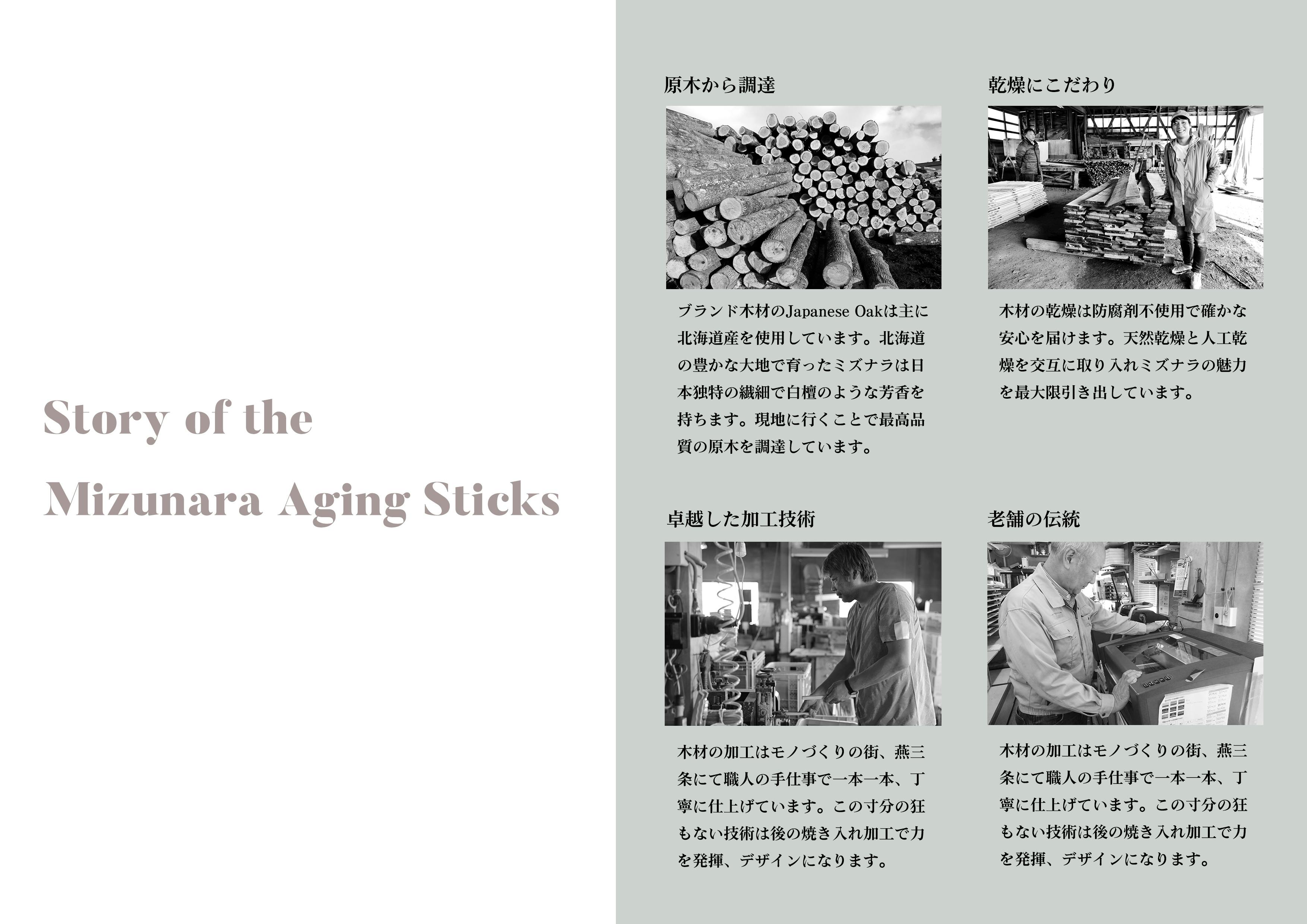 ミズナラスティックとは、家で簡単に熟成ができるプロダクトです。ミズナラはどんぐりの木で、海外ではオークと呼ばれ、ウイスキーやワインの熟成をするために樽で使われている木です。日本のミズナラの木は白檀のような日本らしく繊細で高貴な味わいが特徴。弊社では北海道の現地まで調達に行きまして乾燥時の安全性などを確かめ木材の仕入れをしています。加工はすべて新潟県内と自社で行っております。