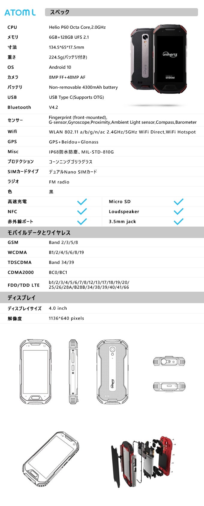 AtomLは片手で持ちやすいサイズと大きいスクリーンを同時に持つことで誇っています、野外活動や日常生活にも適応します。AtomLは野外探検に完璧に対応しています、もちろん特殊な工場で働いて、頑丈なスマホが必要な人にも良い選択。例えば救助人員、軍人、警察、建設労働者や炭坑作業員等。