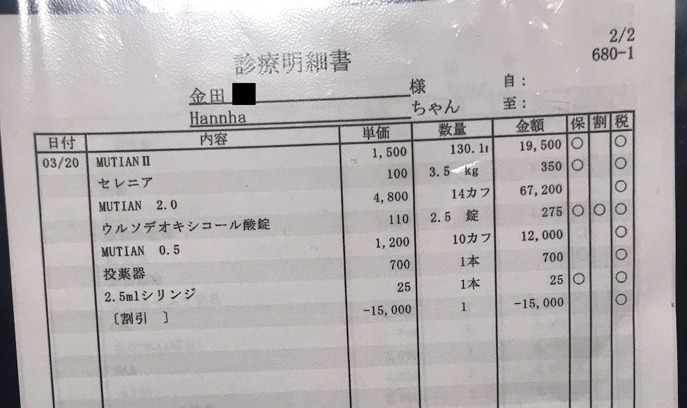 MUTIANは9600円/1日の投薬を84日間連続で行う必要があり、3.1kgのハンナは約400mgの投薬を始めています。薬代だけで単純計算すると約80万、また体重が増えるにつれて投薬量を増やす必要があるため金額が上乗せになります。さらに血液検査や精密検査を定期的に行う必要があるので100万近くかかると考えています。