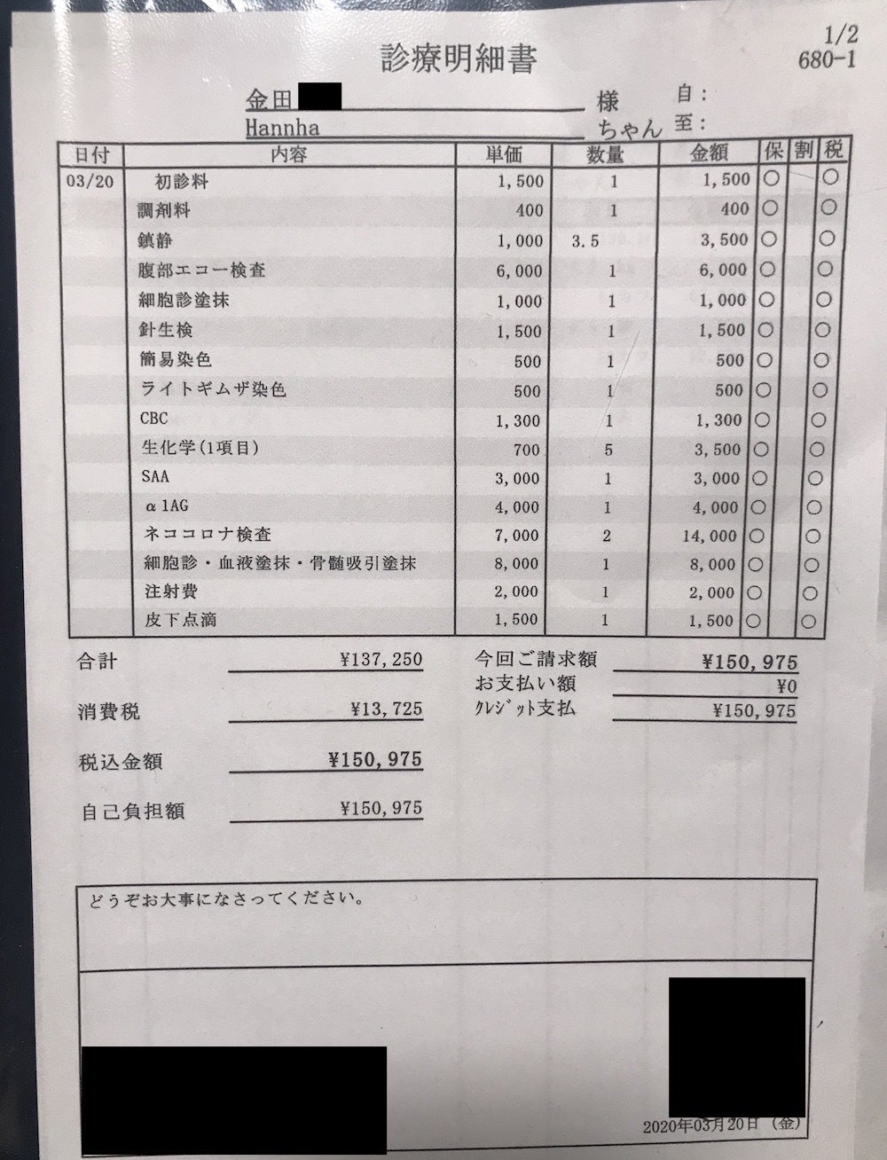 2020/07/17 12:39こんにちは、お久しぶりです。プロジェクト終了後、何も投稿せず皆さんにはご心配をお掛けしてしまったかと思いますが、ハンナは6月11日に無事投薬が終了しました。投薬終了直前に病院で血液検査や外注検査を受けております。特に問題はありませんでした。その後、1ヶ月間観察期間に入りその間は体調の変化がないか気をつけて見守っていきました。そして先日12日に再度、病院に行きFIPが再発していないか最終検査をしました。これはハンナの避妊手術の術前検査も兼ねています。一昨日、外注検査の結果が出て先生から電話があり、肝臓の数値が少し高いけど(ウルソを飲ませることになっています)大きな問題はなかったとのことでした。再発する子のほとんどが投薬後1ヶ月で再発してしまうらしいので、気の抜けない日々でしたが安心しました。ハンナの発情は本人(猫?)にストレスがかかっているように見えるのでなるべく早く手術を受けた方が良いだろうと家族、先生の意見が一致したので来週に実施することになりました。ここに辿り着けるまで本当に長い道のりでした。本当に皆様のおかげです。投薬終了直前(6/7)に行った検査結果と明細書7/12の明細書活動報告ですが今回の投稿を最後に終了させて頂きます。あまり活動報告を更新できませんでしたが、ご理解いただけますと幸いです。今後、ハンナとサミーの日常的な様子はインスタグラムで不定期に投稿していきたいと思います。また、リターンの件ですが少し予定より発送が遅れています。申し訳ありませんが、気長に待っていただけますと幸いです。手紙やメールを送っていますが、返ってきてしまった方が数名いらっしゃいます。そちらの方にはできる限り別の方法でご連絡させて頂きます。数ヶ月間、ハンナを応援してくださり本当にありがとうございました。沢山の励ましを頂き、ハンナだけではなく家族全員が支えられました。新薬MUTIANが国に認可され、全国のFIPの子たちみんなが治療を受けられますように。金田 もっと見るリターンのサンプル