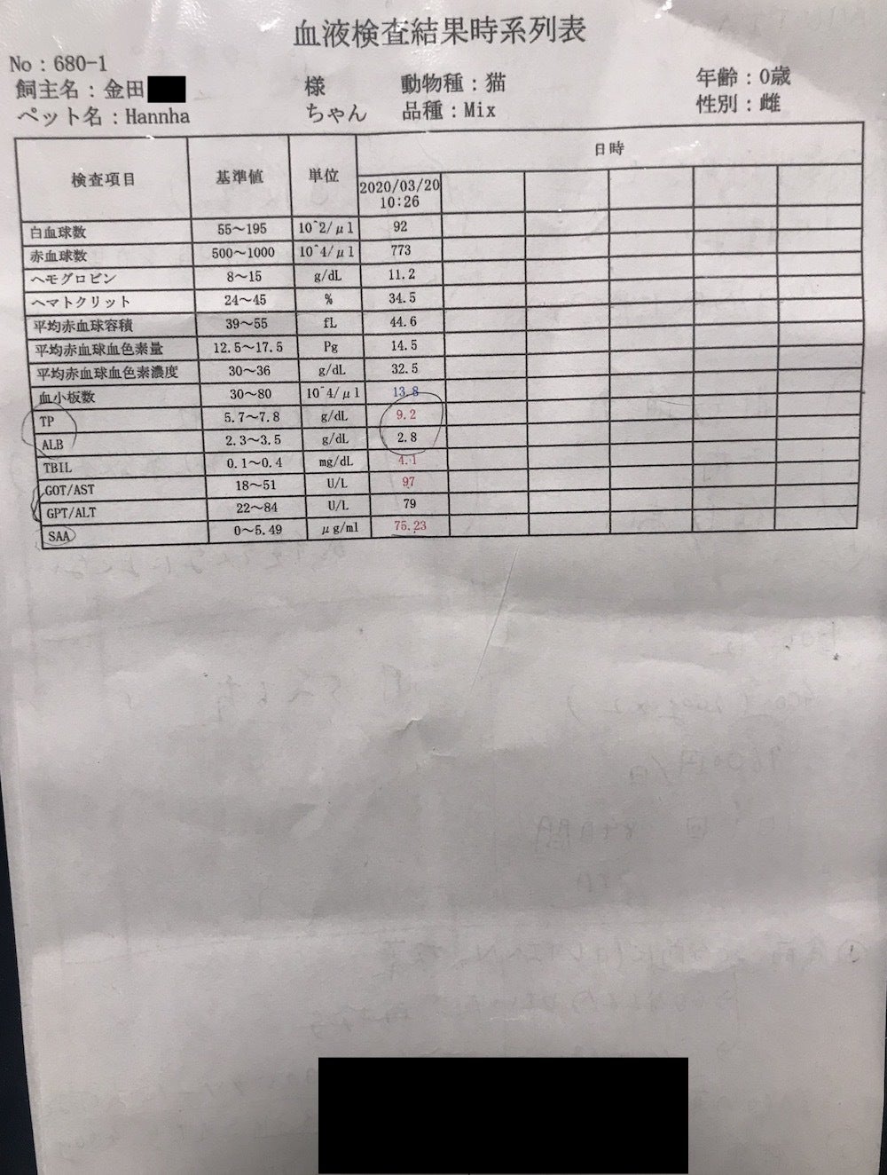 2020/04/20 13:11こんにちは。コロナで皆さんの生活スタイルが変わってきている真っ最中だと思います。いかがお過ごしでしょうか。先日このクラウドファンディングは60万円を突破しました。大変ありがたいことです。残り39日間、引き続き見守っていただけますと幸いです。さて、昨日私たちはハンナを動物病院に連れて行きました。血液検査、外注検査(ネココロナ検査)、腹部エコーをしてきました。血液検査の結果はこんな感じですまだ異常値はありますが先生曰く、赤線部分のA/G値が大切らしくこの数値が0.6以上だと治療の効果が出ているということらしいです。A/G値0.77なので良い感じですね。また、TBIL値を今回は出していませんが黄疸の症状が消えたので出す必要がなかったそうです。腹部エコーですが、FBIによってできてしまった肉芽腫(約3.5cm)が気にならない程度に消滅していました!すごいですね。この薬でこんなにすぐに消滅するなんて...次回の診察はコロナのことも考えて、2ヶ月目診察は飛ばし投薬終了(6/11)の直前、6/7に診察の予約をしてきました。ですので6/7までの薬も購入しました。血液検査、外注検査(ネココロナ検査)、腹部エコー、次回診察までの薬で総額523,050円となりました。ちなみに、次回の診察時にはこのクラウドファンディングは終了しています。終了後もシステム上投稿できれば、何度か活動報告させていただきます。(投稿できなければ、私のインスタの方で活動報告させていただきます。)ハンナとサミーは(保護猫なので推定ですが)23日に1歳の誕生日を迎えます。皆様のご支援のお陰で無事に1歳を迎えられそうです。とても嬉しいことです。動物病院に頻繁に通っているからなのか、既に5年くらい飼っている気分です(笑)やっと1歳、、でもまだ1歳。これからもっともっと長生きしてほしいですね。その為にも投薬の遂行に励んで参ります。金田 もっと見る