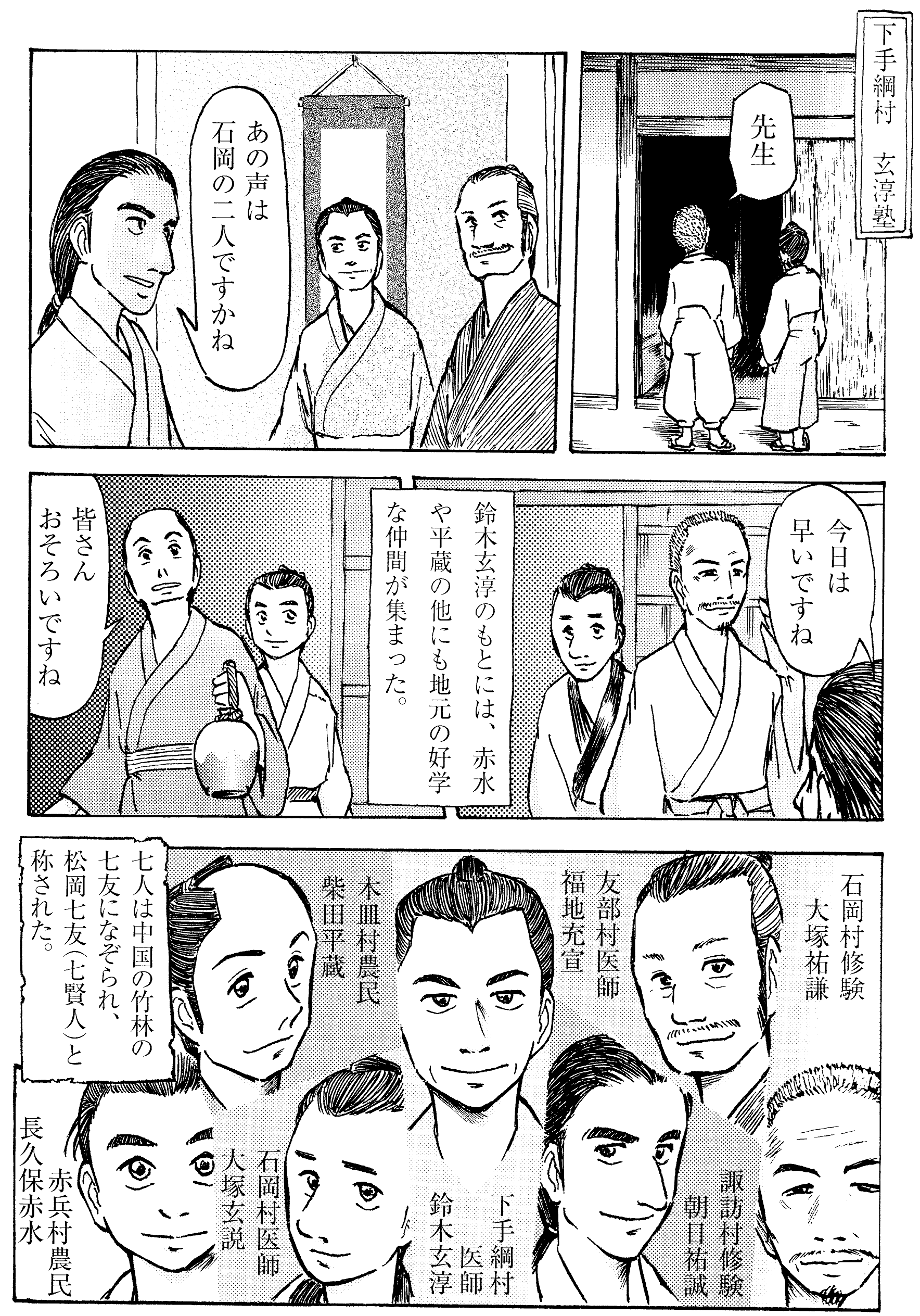 この赤水の生い立ちは、顕彰会会員の原康隆氏が制作した『マンガ・長久保赤水の一生』に分かり易く描かれています。