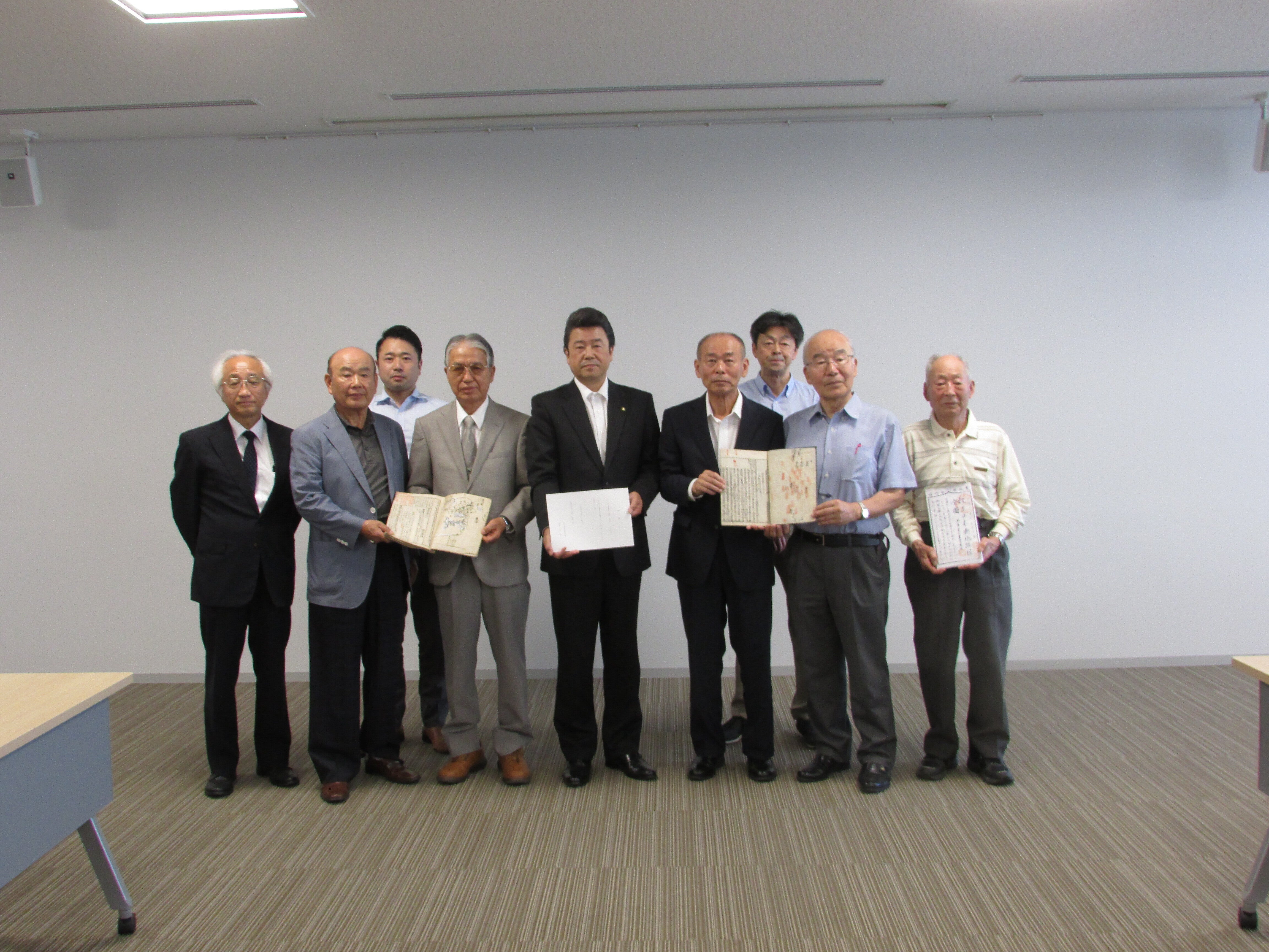 昨年6月に顕彰会から高萩市役所へ赤水関係資料(299点)を贈呈した時の顕彰会員の写真