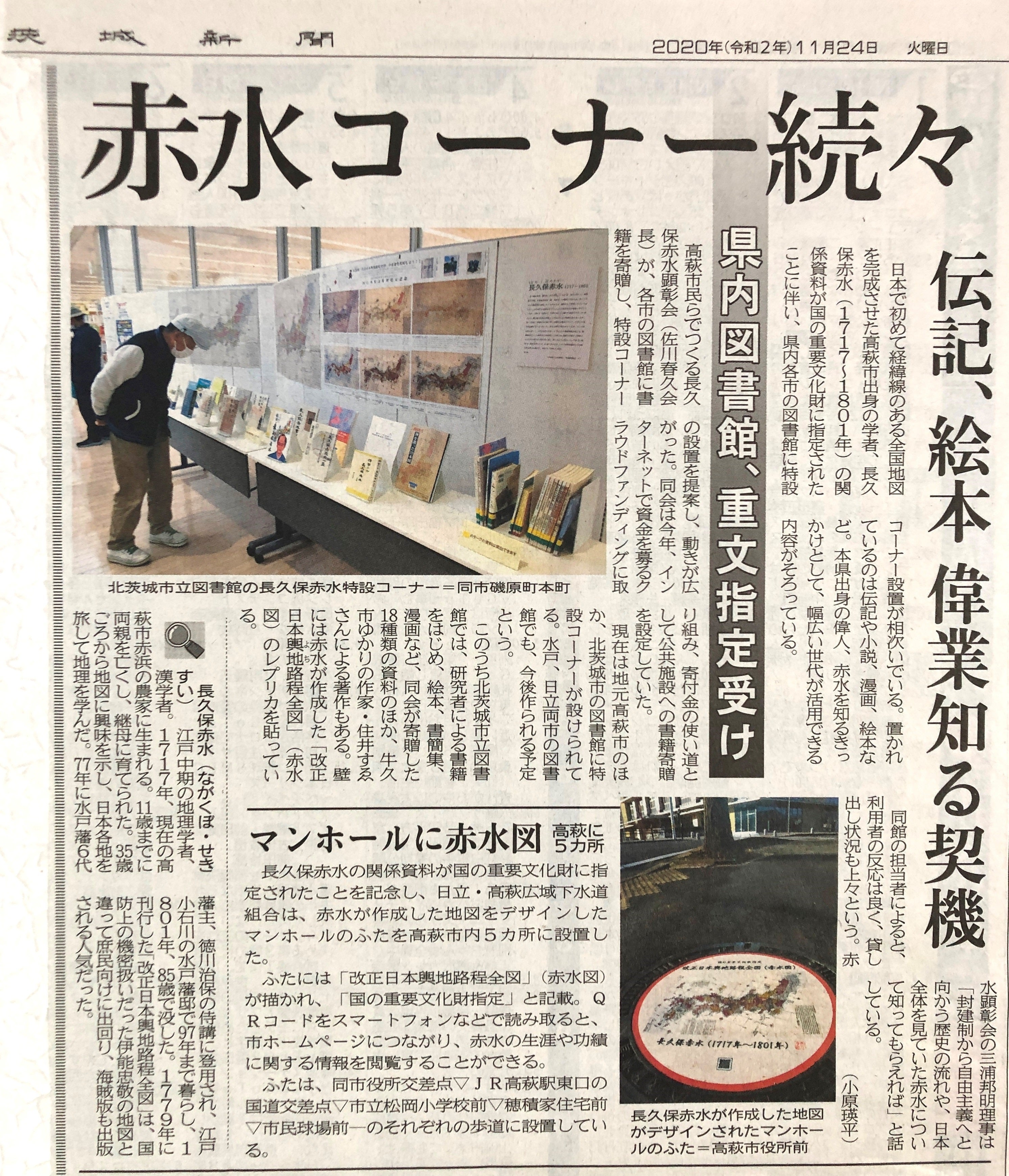 12名の支援者様のお力添えで実施しました赤水図のレプリカと赤水関連図書の寄贈は、高萩市をはじめ北茨城市、日立市(4カ所)、水戸市(6カ所)の図書館に行い、茨城県立図書館様においては顕彰会による寄贈不足が確認されましたので不足分を補充させて頂きました。寄贈後、図書の分類作業を終えた高萩市や北茨城市の図書館において赤水コーナーが設置されとの報道が、11月24日付茨城新聞にてなされ、茨城新聞社のご厚意により無償掲載の許可を頂きましたので、ここにご報告させて頂きますと共に、あらためましてご支援を頂いた方々に篤く御礼を申し上げます。