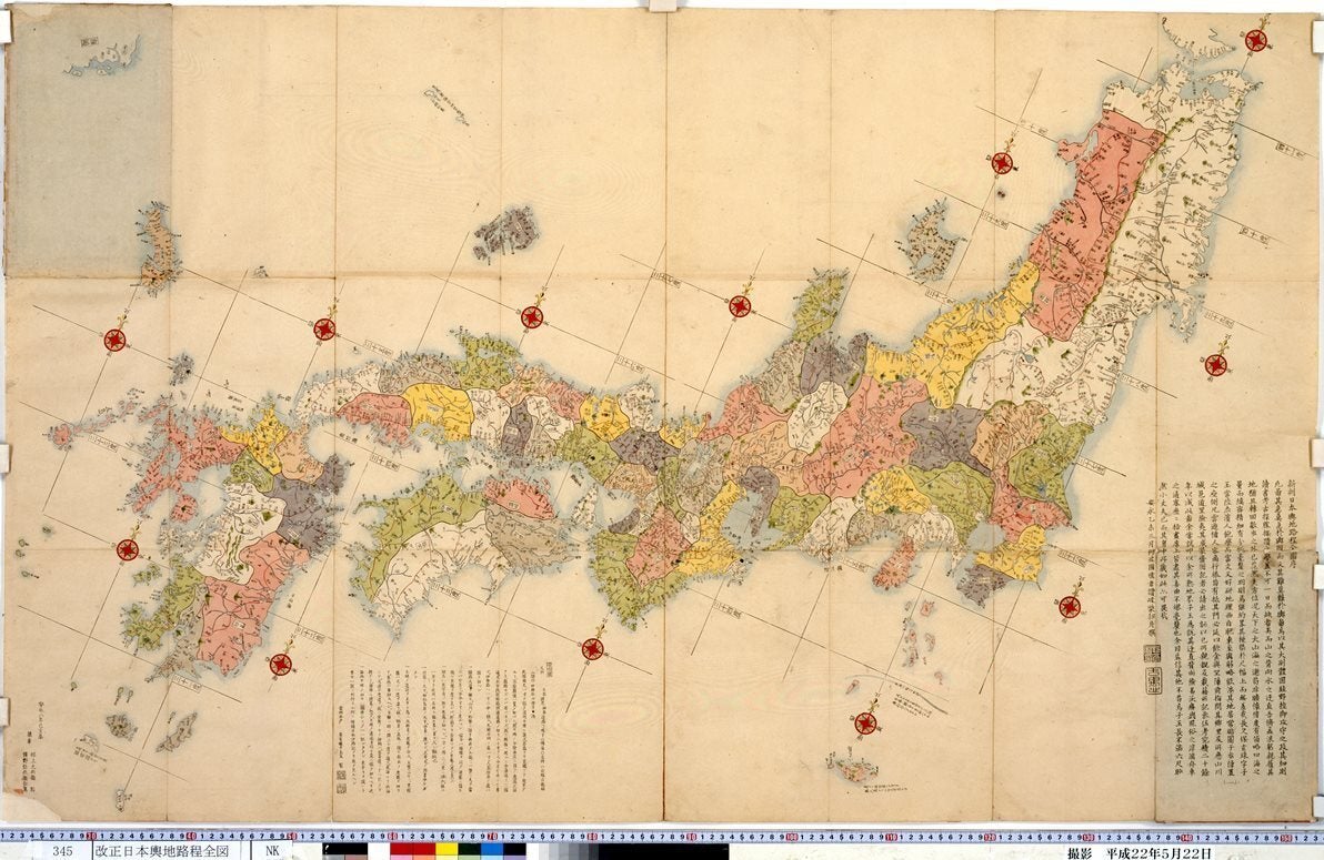10里を1寸とし経緯線が引かれ約4200の地名が記された画期的な刊行日本図