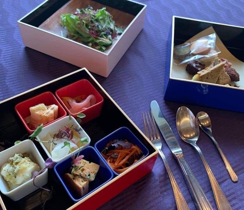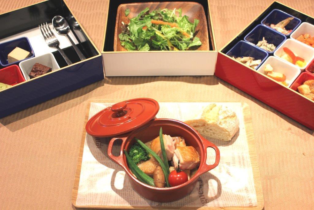 トリコロールのお重にフレンチのコースを盛り込んで、ピクニック感覚でお楽しみできます。