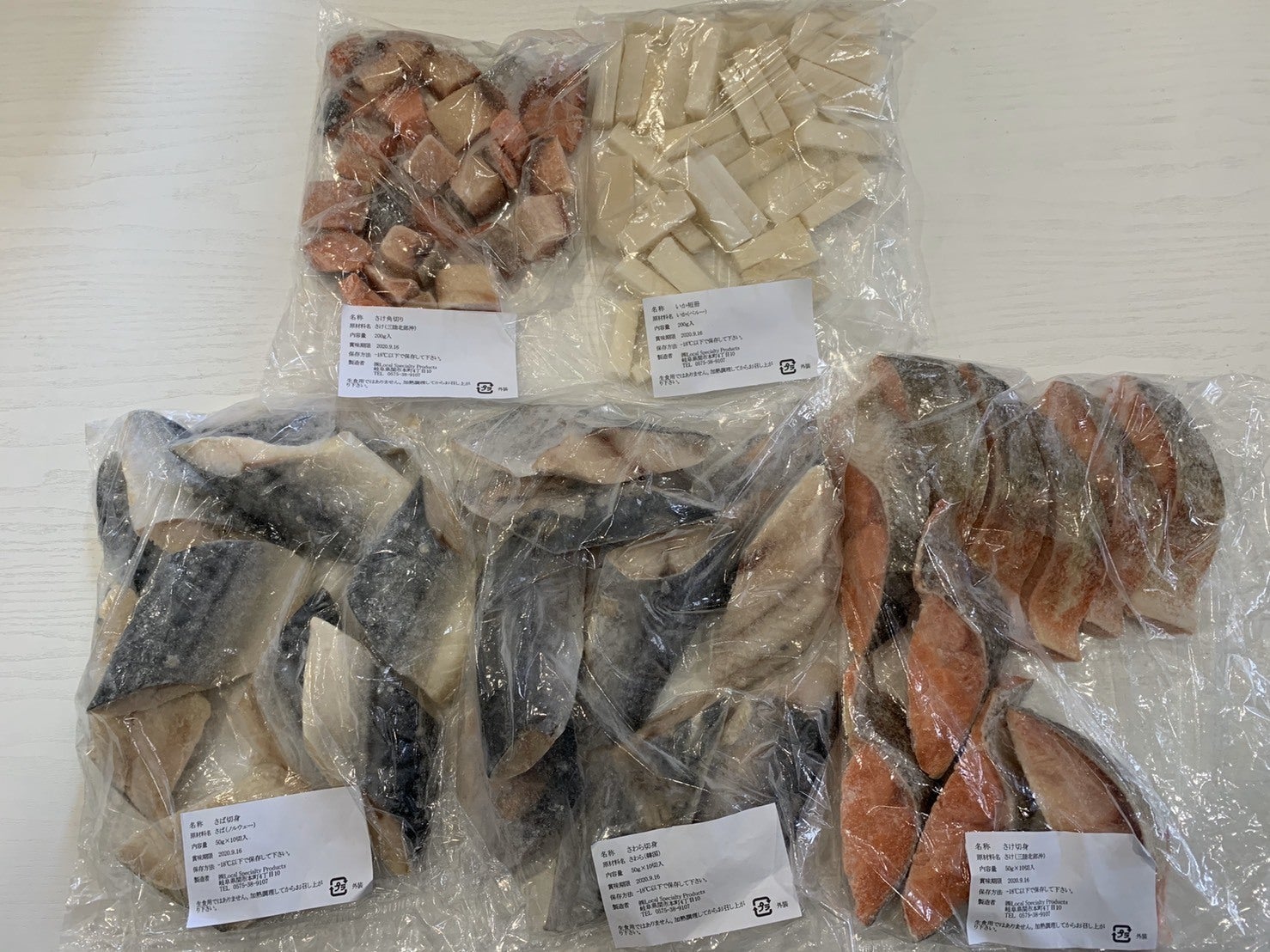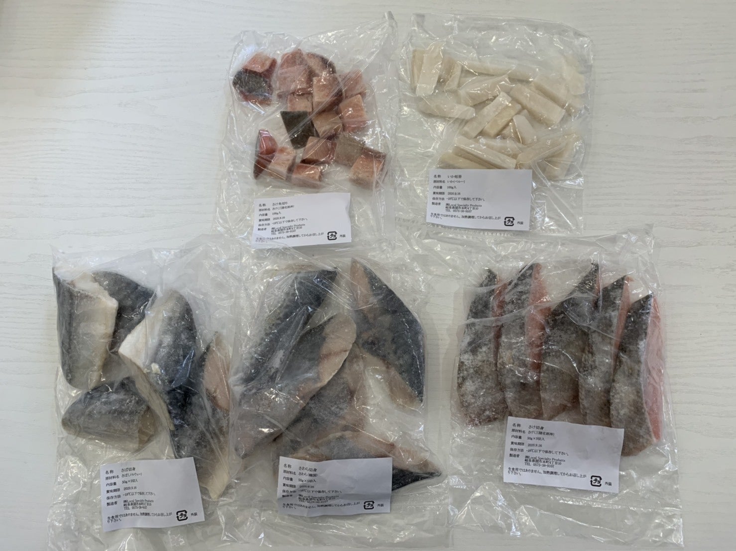 内容は、「さけ切身50g50切」、「さば切身50g50切」、「さわら切身50g50切」「学校給食定番のおさかな5切れセット」、「学校給食定番のおさかな10切セット」です。
